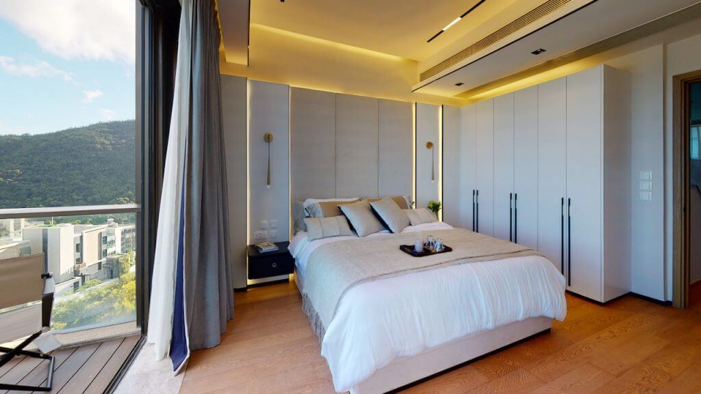 The project is located in the superior location of the traditional mansion in Cove Hill. The overall style is mainly simple, but full of fashion with a lot of white space and a small amount of black accents. The large floor-to-ceiling windows leading to the terrace and the white wall make the living room bright and bright, and the scenery is panoramic, away from the bustle of the city. The floor and TV wall are made of Italian marble nano-tiles with intricate patterns, which form a strong contrast with the darker dining tables, wall cabinets and other furniture, setting a comfortable and unique atmosphere for the entire space. The tall Buddhist Pine in the garden is a highlight, which incorporates a little Chinese element into the simple Western style house. The cabinet door and floor of the master bedroom are made of matte lacquer and different wood grains to complement each other, which is low profile and full of texture. The overall style of the bedroom uses warm colors to match, with light-colored wood grain, adding an elegant feeling.