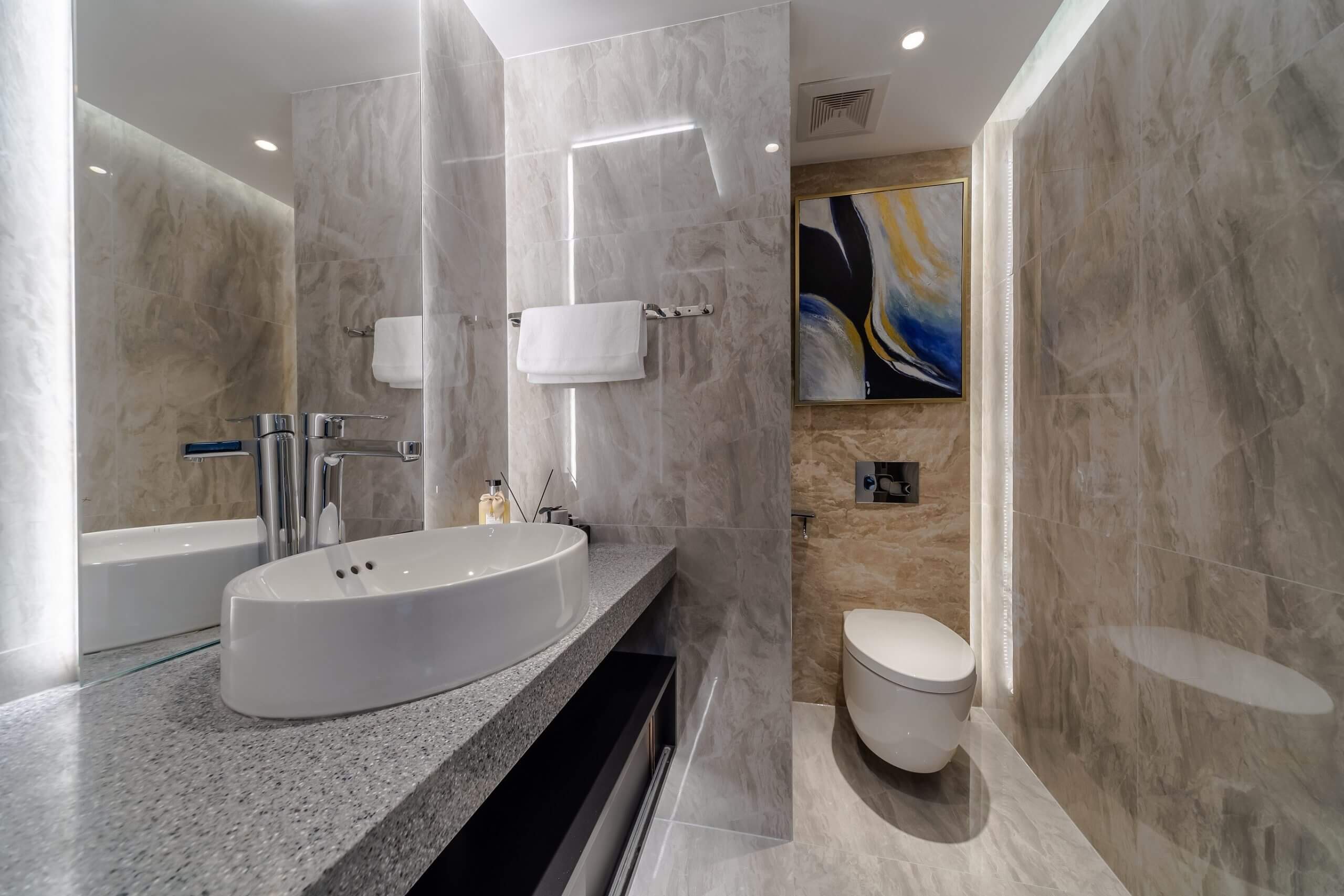 Entering the living room, what you see is a large piece of marble spread on the TV wall, matched with the calm wood, and embellished with steel branches, in contrast to the dark gray marble floor. In order to add a sense of hierarchy to the space, the large-scale furnishings in the house include sofas, coffee tables, dining tables, etc., all in shades, coffee, and tea. The characteristic pendant lamps with geometric lines are hung on the mezzanine ceiling, which is simple and stylish.