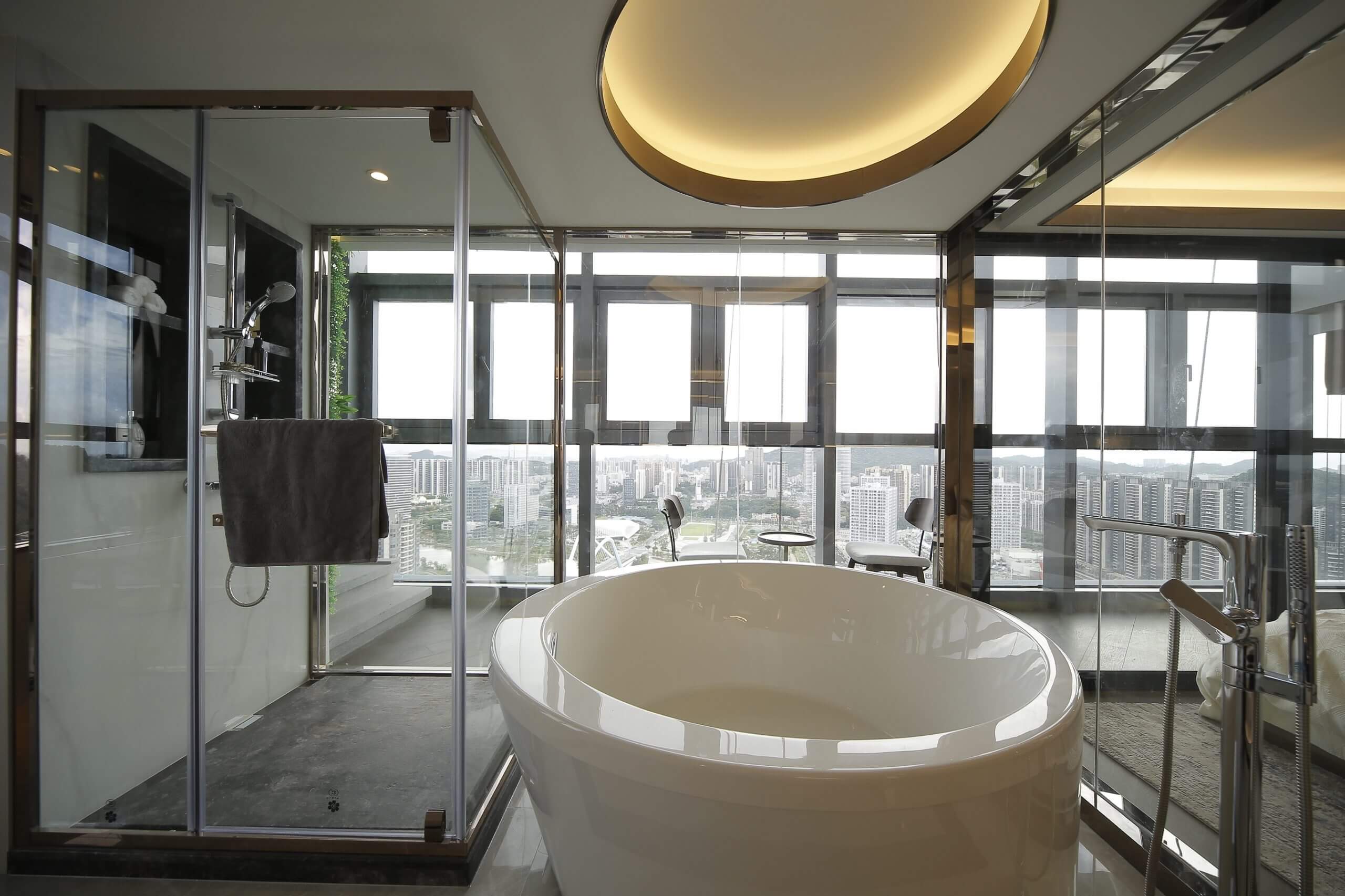 The master bedroom on the upper floor is dominated by earth colors, and the headboard uses wallpaper with different textures to create a characteristic wall, creating a simple and modern feeling. The floor is covered with light gray carpet. In order to create the greatest sense of space in the limited space, the designer uses the glass wall as the bathroom partition, which allows light and sight to penetrate each other. The black frame design on the glass wall and door echoes the design feeling of the lower level. consistency.