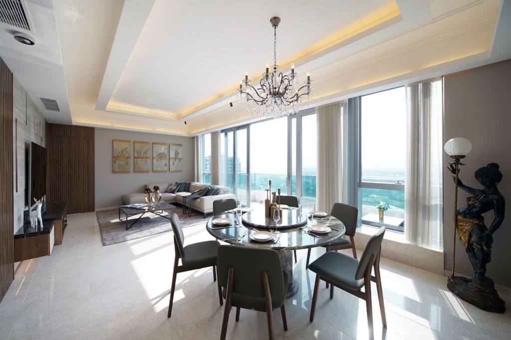 The unit has a rooftop, and the terrace is covered with outdoor wood. In addition to the outdoor sofa and dining set, Eric also has a bar for the family, at the same time potted some flower plants to add a natural feeling. Imagine having barbecue here in holidays!
