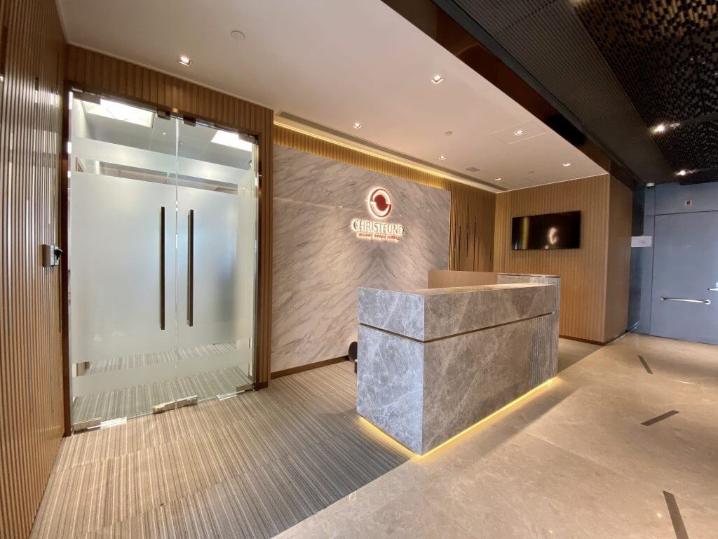 一出電梯門映入眼簾的便是一幅落地雲石特色牆,配合兩側滲光效果、牆壁上木條子設計與及接待處雲石檯面的圓角設計,打造出一個時尚簡約的空間。