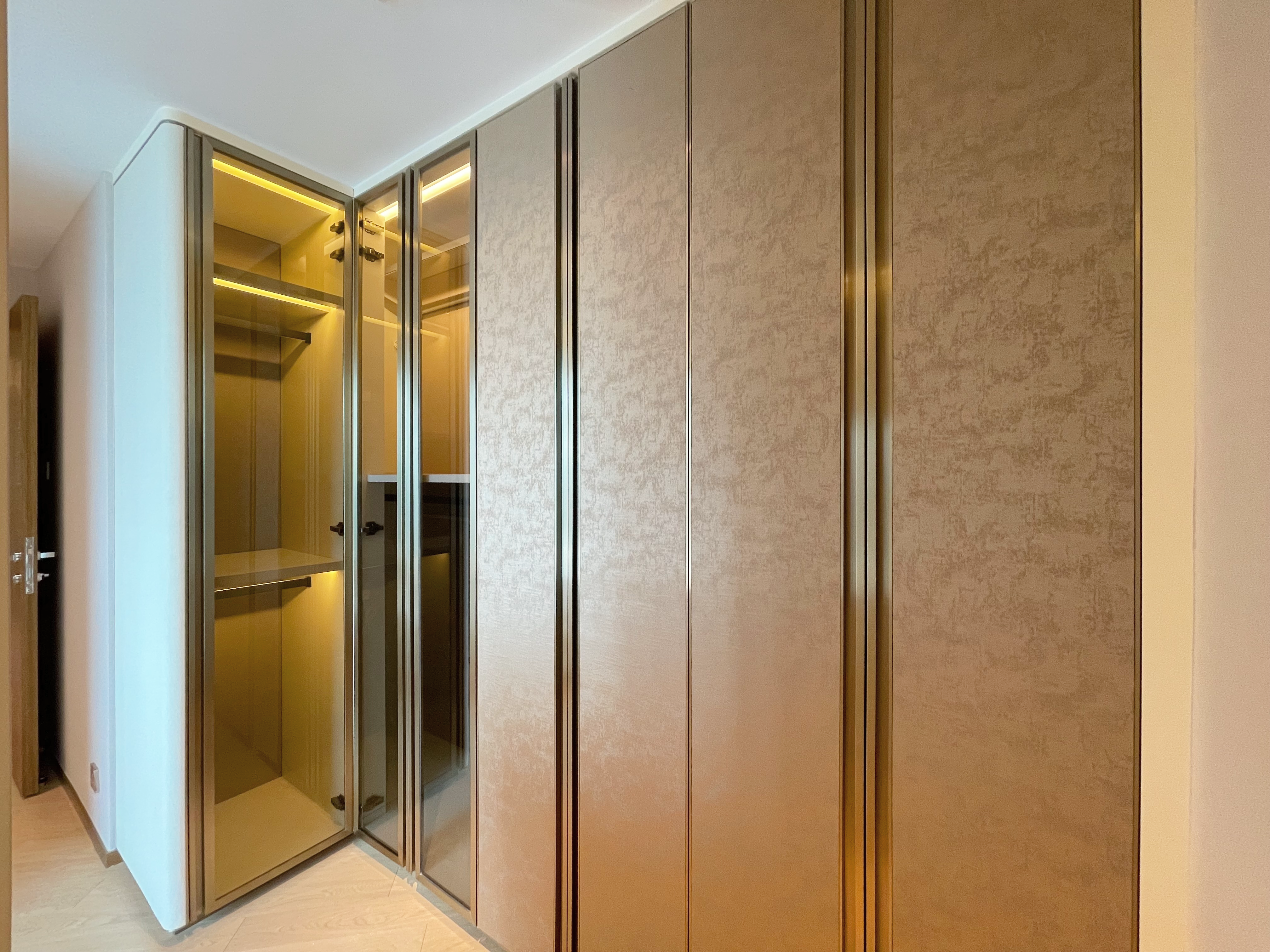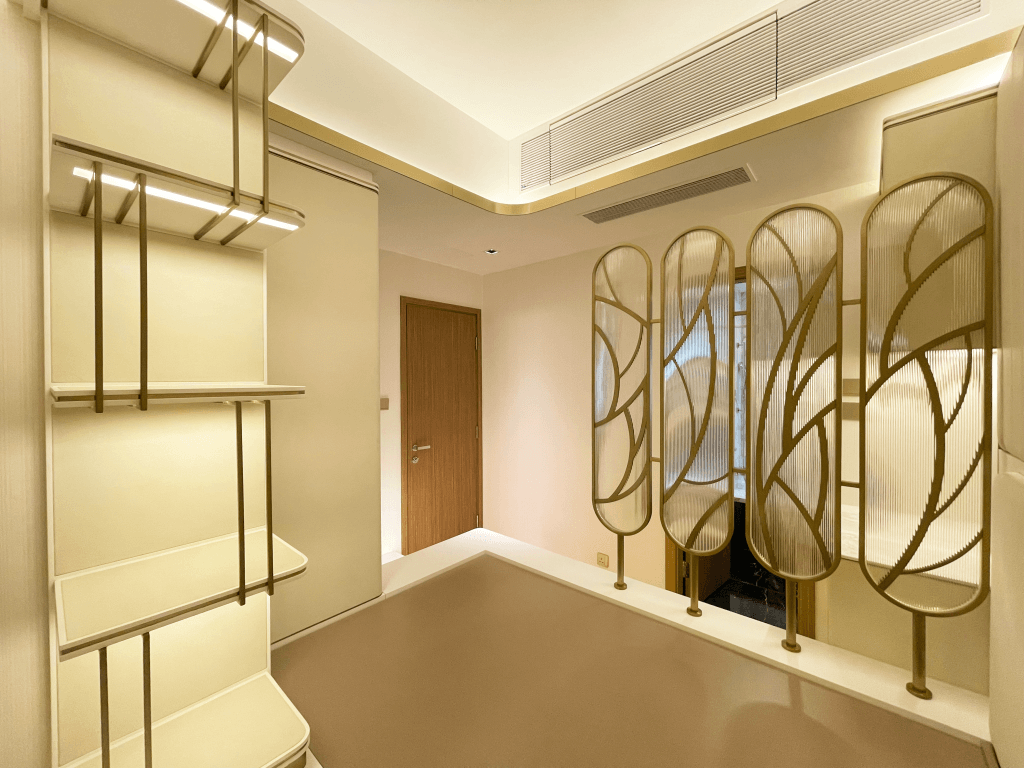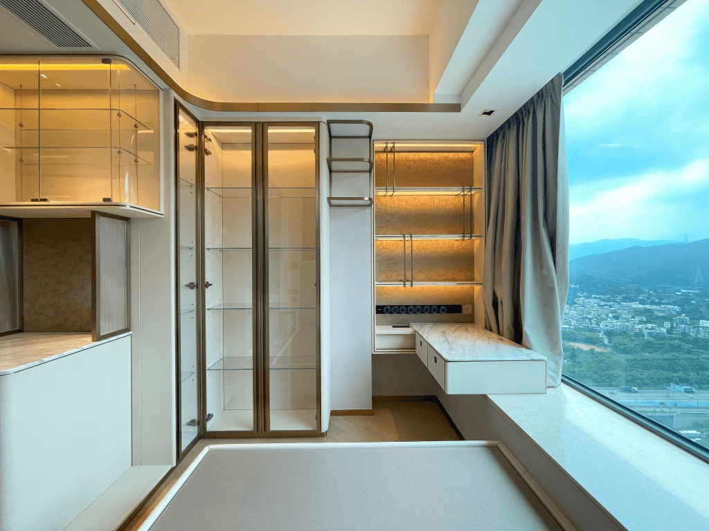 展示櫃配有滲光,金屬和玻璃打造,豐富了整體房間的層次感之餘,同樣可以襯托出高雅而不俗氣的現代奢華美感,同時又不失功能性。