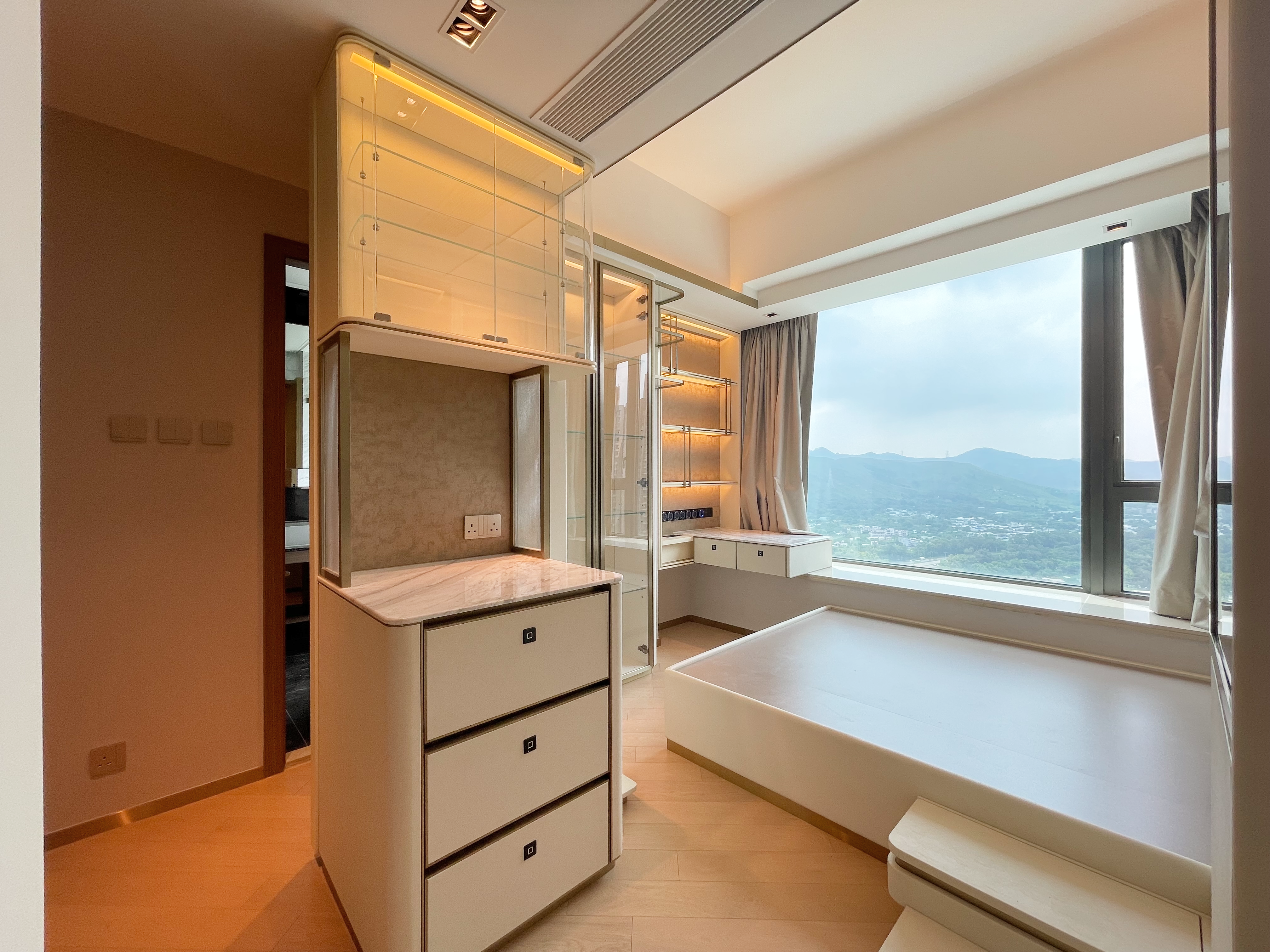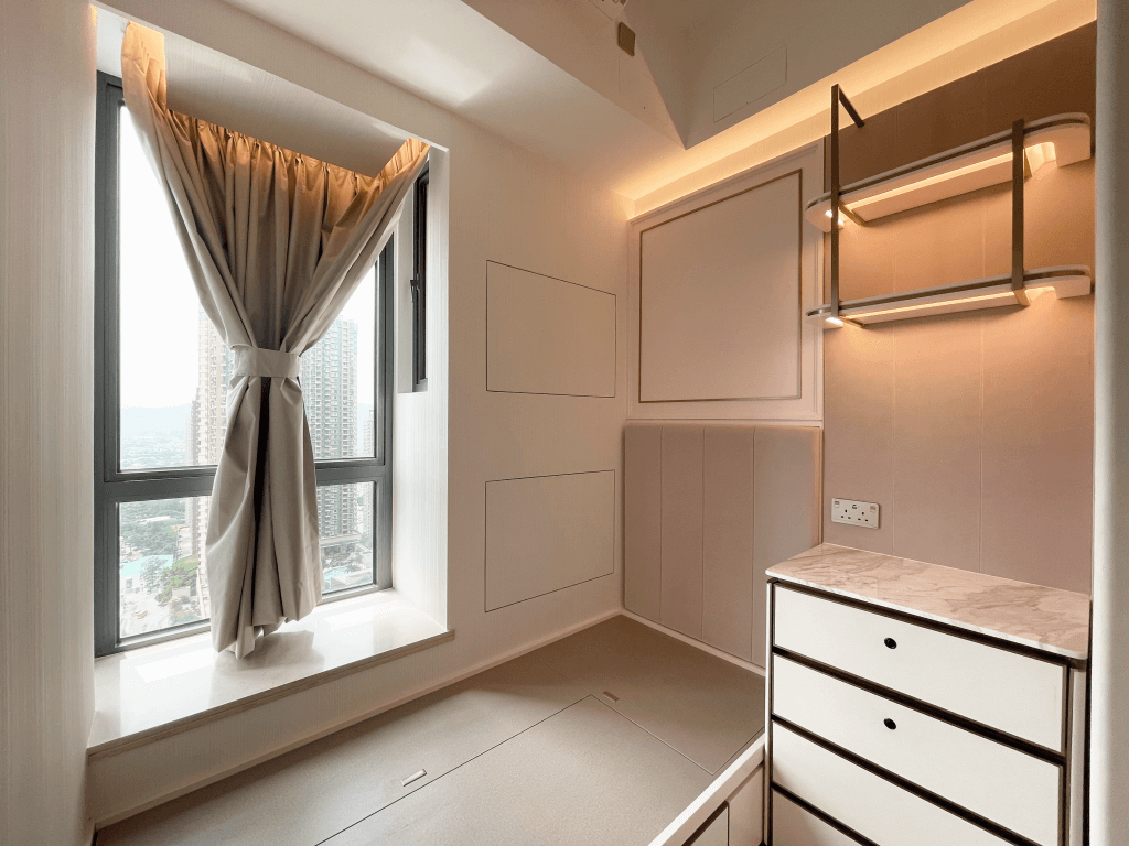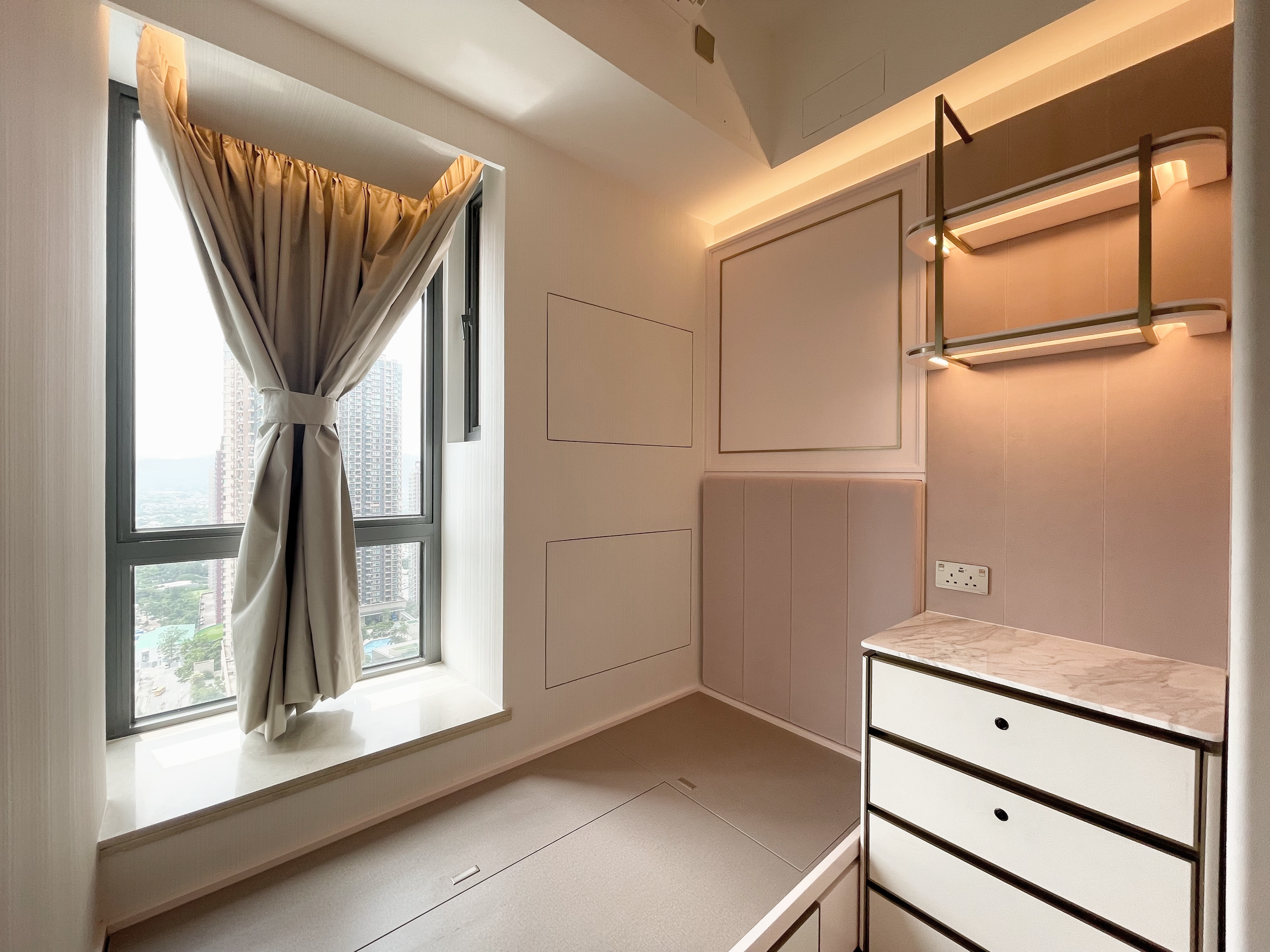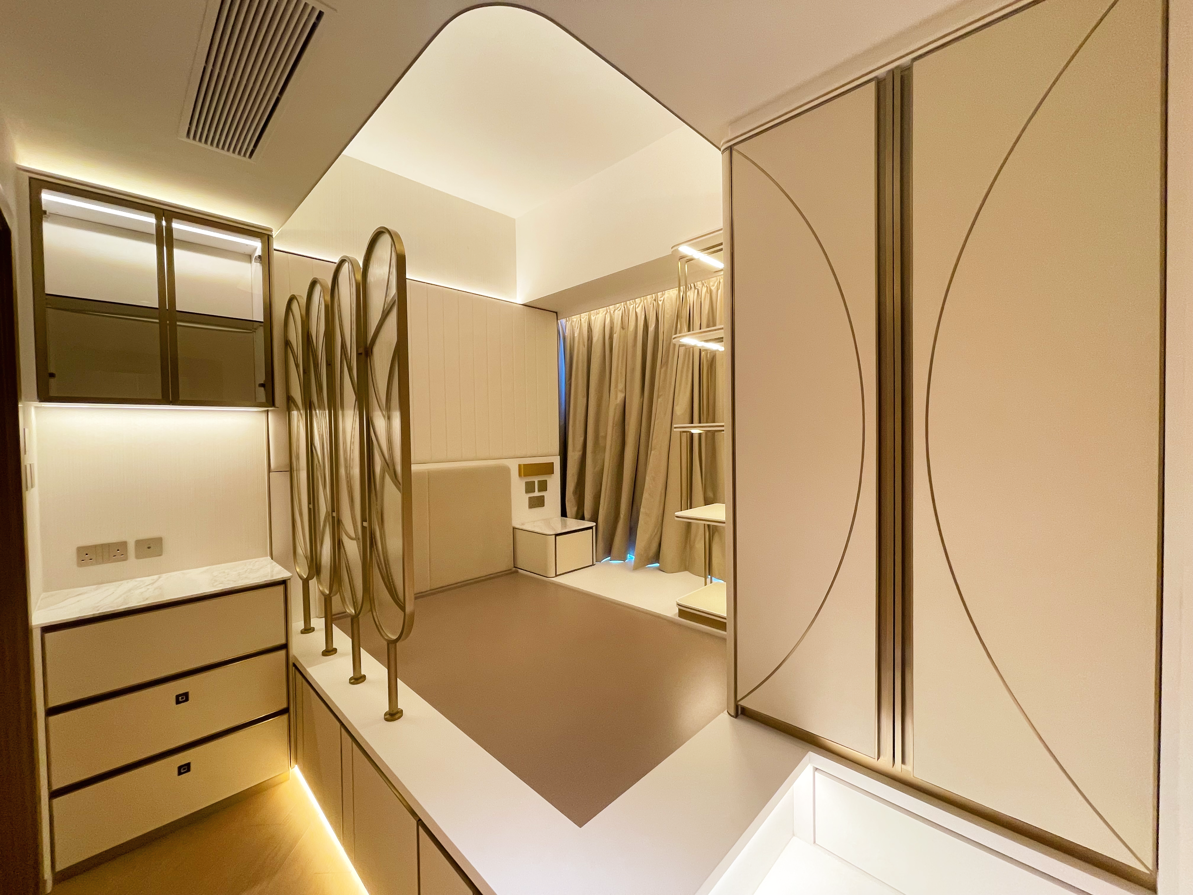 主人房房間,設計師配合戶主特別的喜好和要求,打造由高至低,不同深淺的特色展示櫃;給戶主放置最愛的模型收藏,