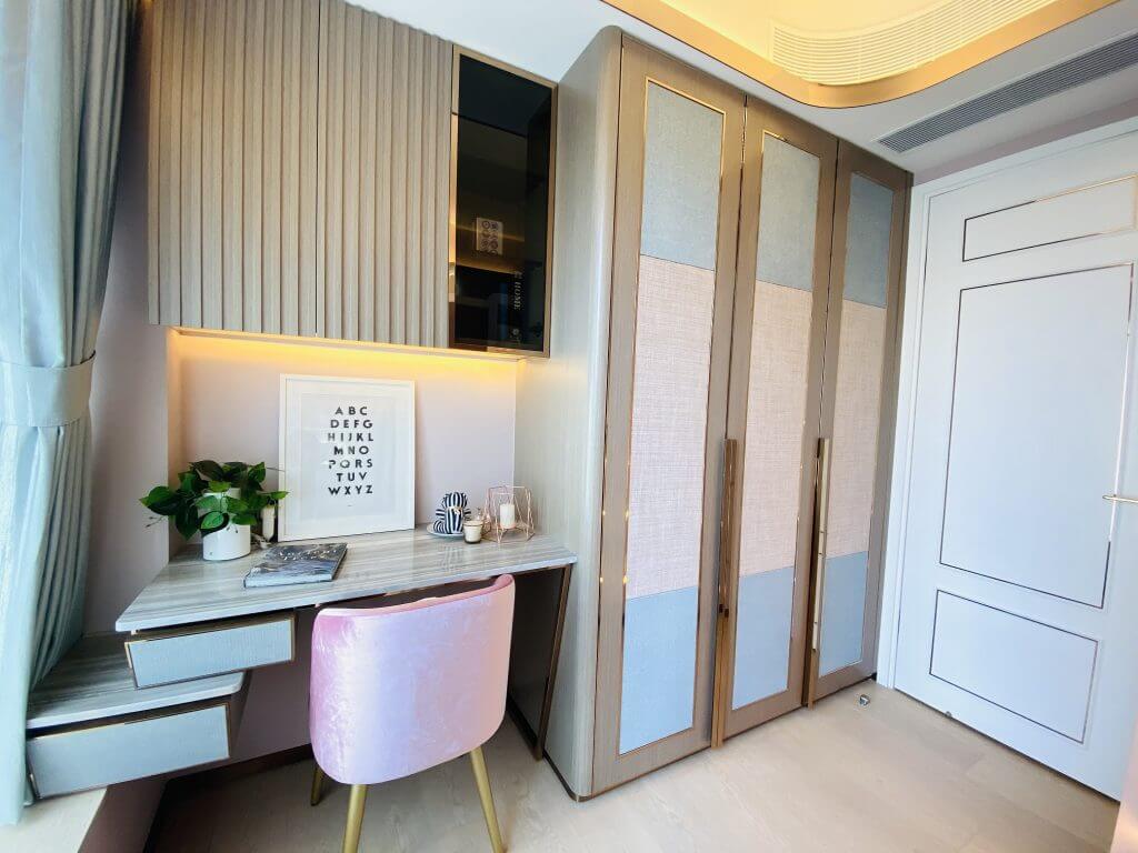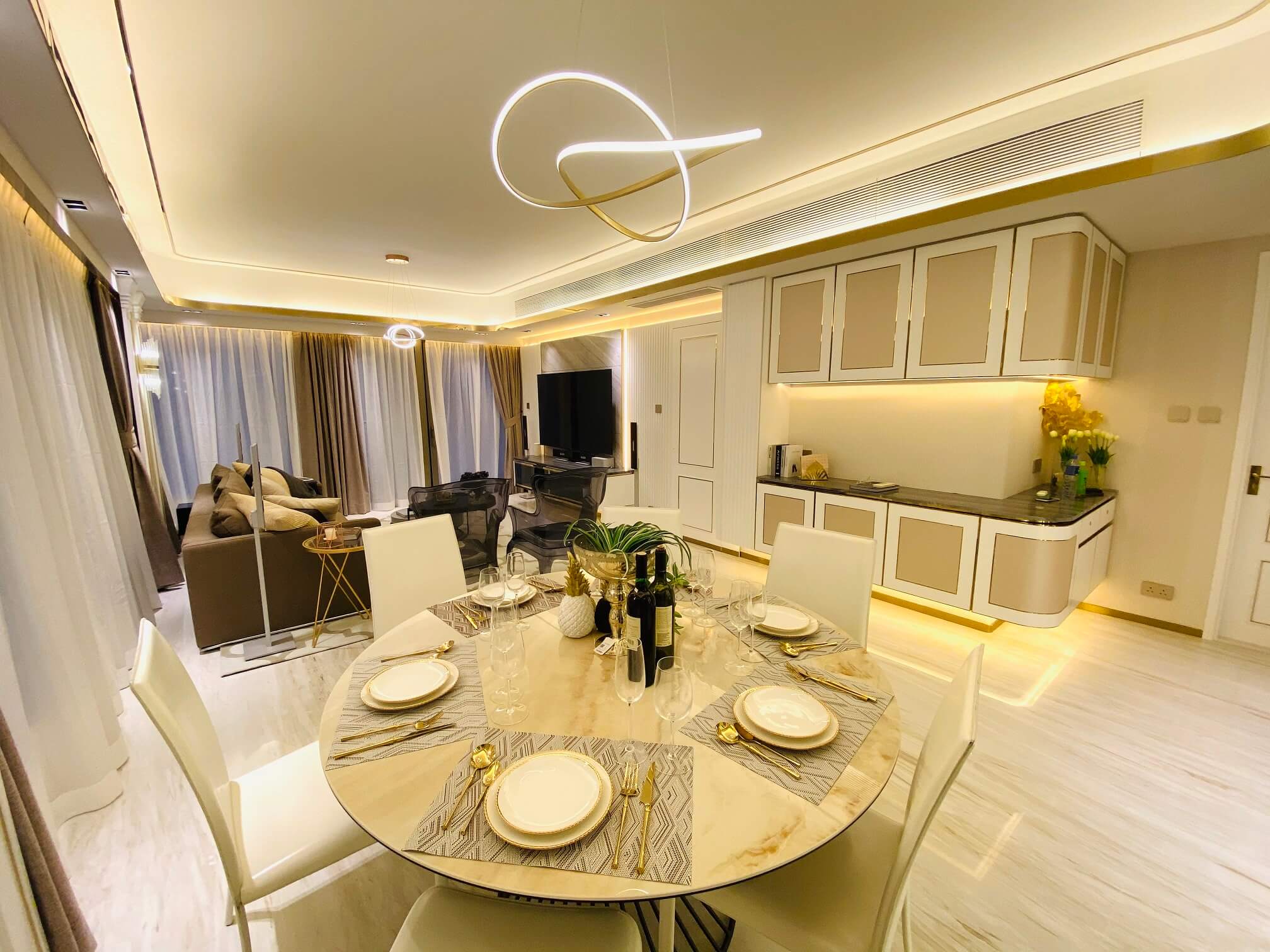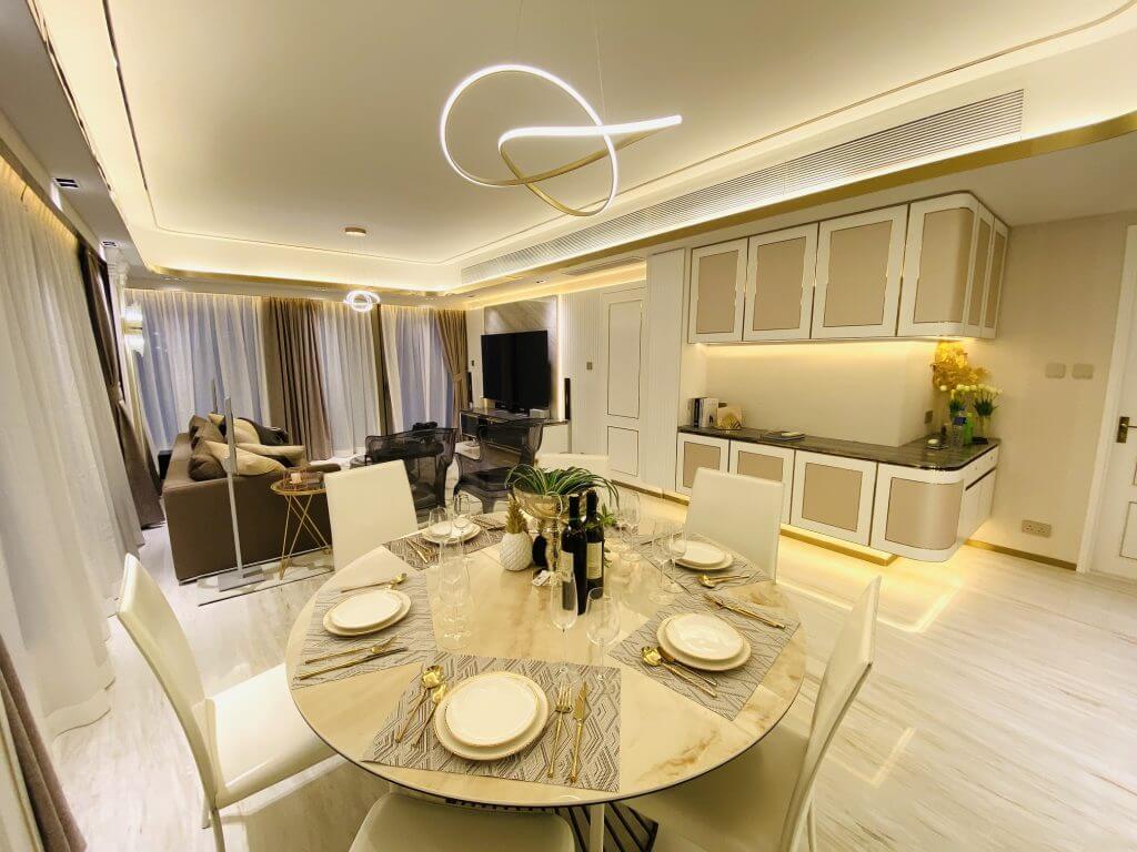 ,是次項目以現代歐式設計為主,整體以溫馨的淺色調為空間底色,由白色與米黃色系打造溫馨典雅的家居環境及大氣的歐式風情。主次分明的空間格局讓整個單位層次鮮明。客廳內更增設了一個玻璃展示櫃,可以擺放屋主的飾品,也彰顯出屋主別樣的生活品味。