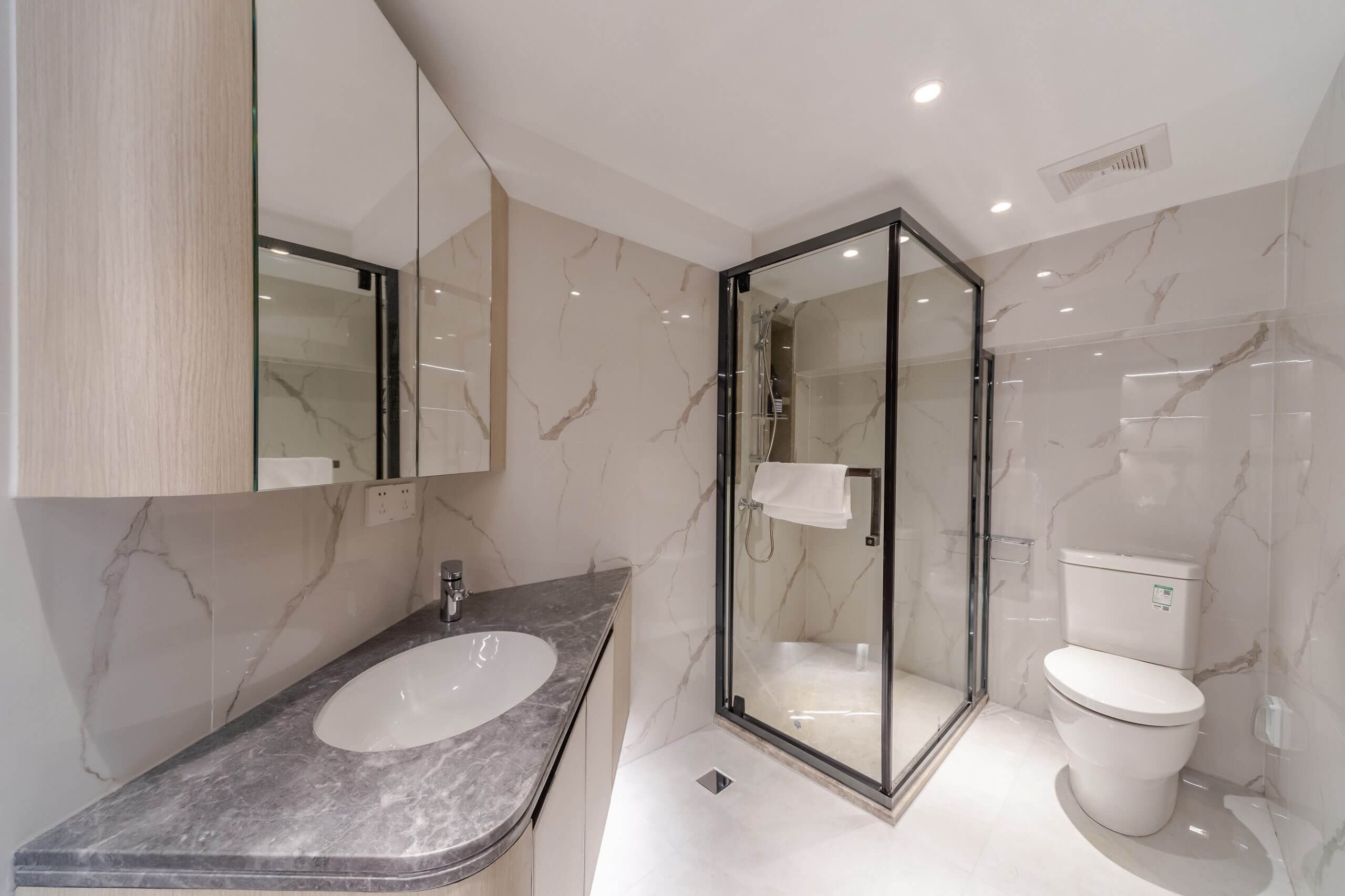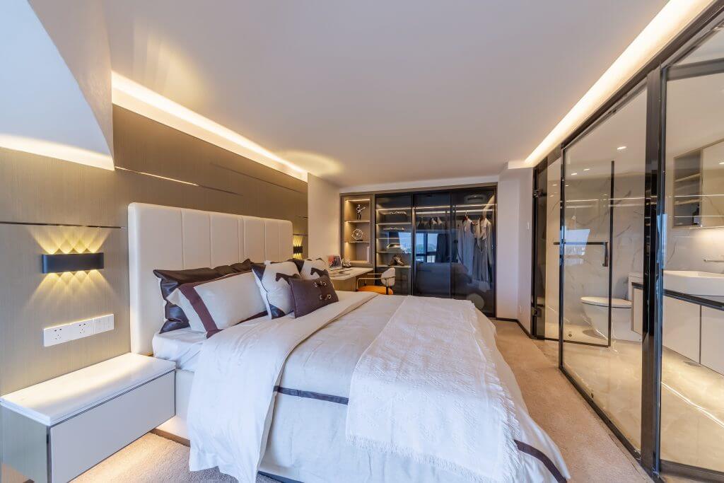 另一邊的客臥以淺灰色為主調,達到整體簡約而舒適的一致性。浴室以玻璃牆身配上黑鋼框,給人帶來前衛、不受拘束的感覺,並充分運用自然採光與視覺穿透性的設計。