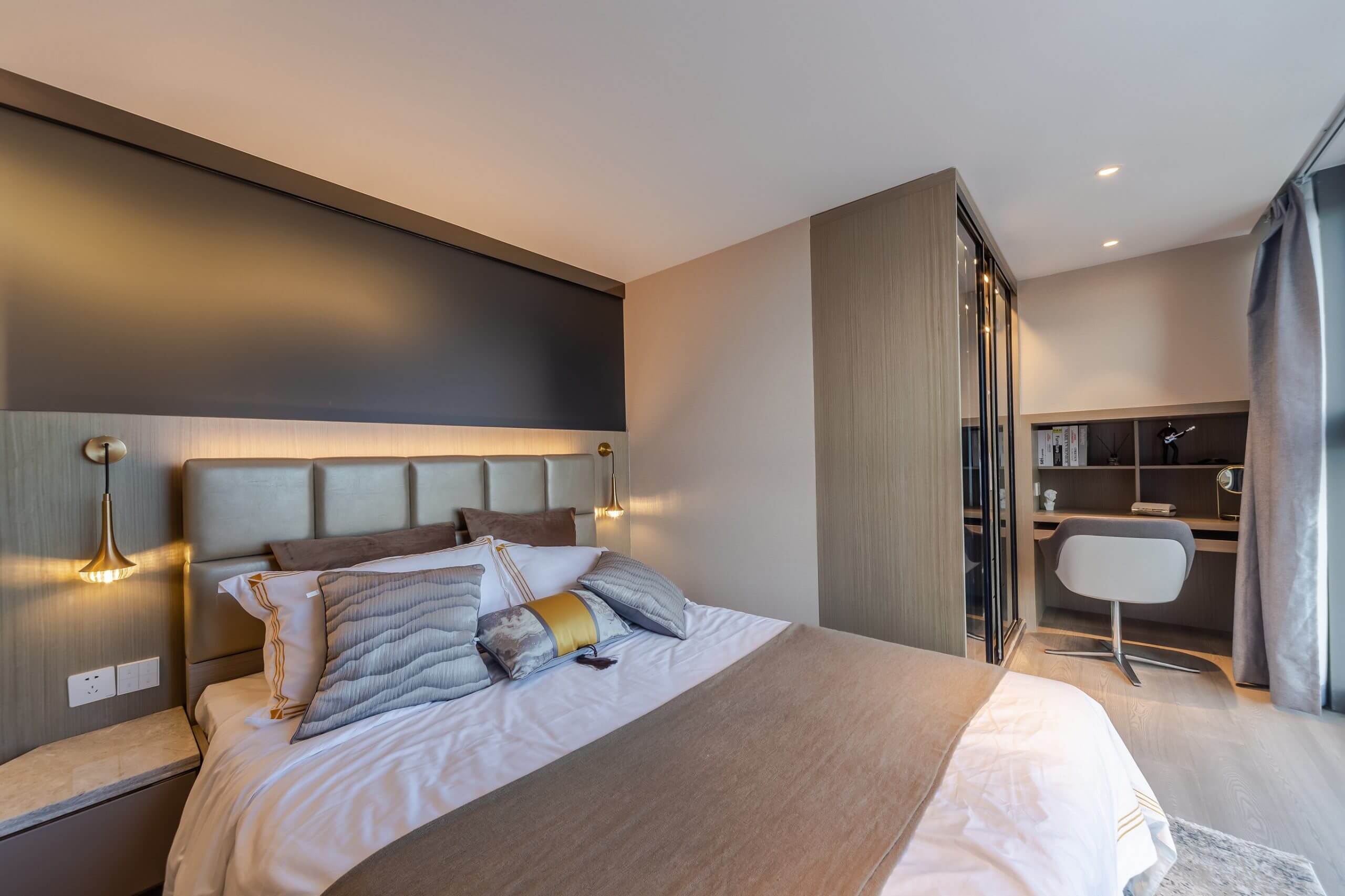 主人臥室臥室整個空間以啡色為基底,沒有過多的裝飾,簡潔的家具飾品,氣質大方,契合精緻而不失隨性的生活態度,攜引閒適自在的氛圍,整潔的空間強調舒適的休憩功能。褪去浮華,餘下便是過盡千帆後的釋然與從容。