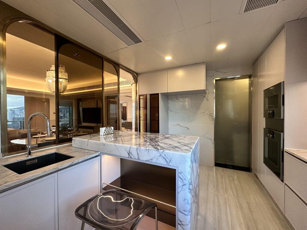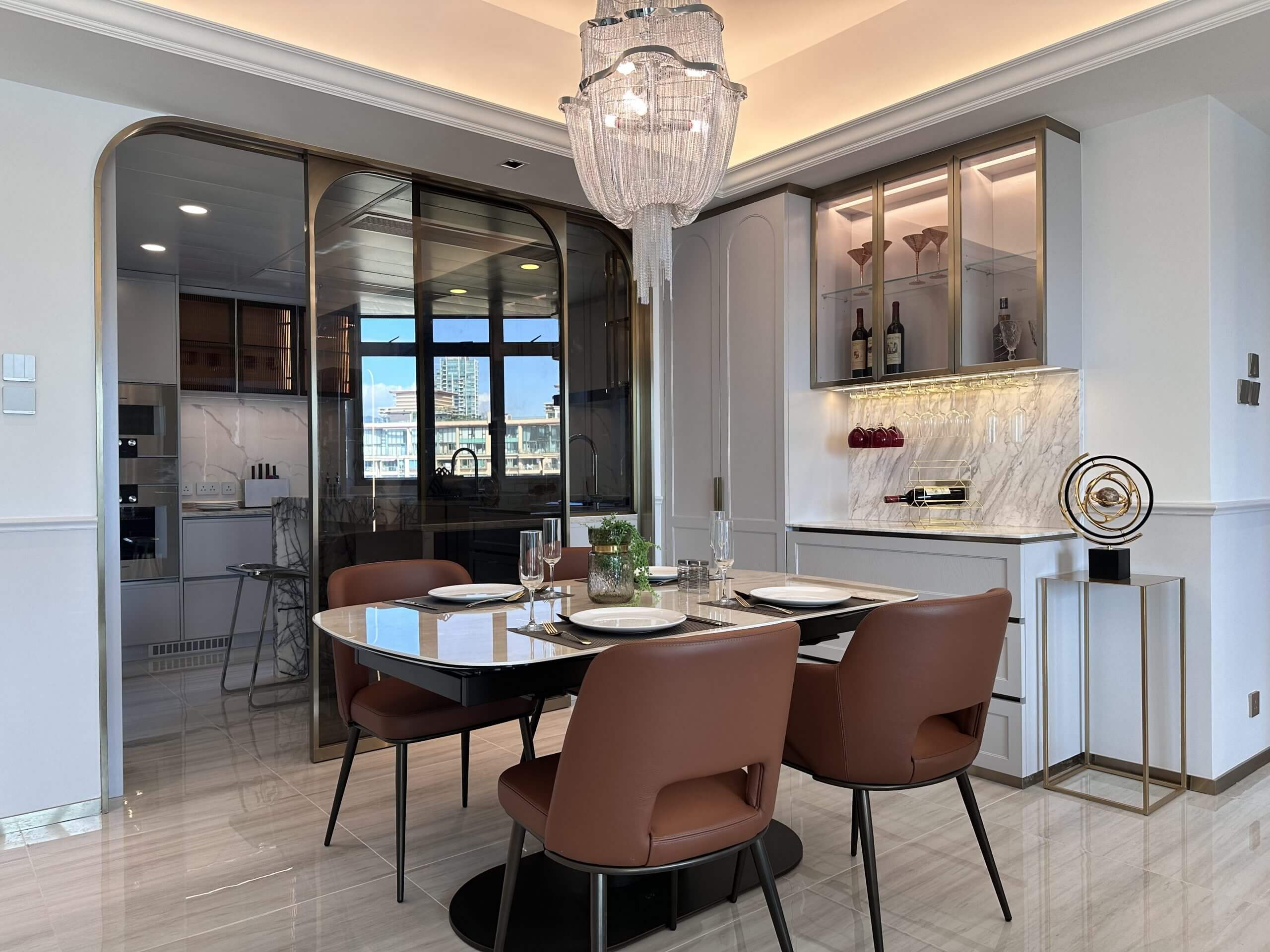 廚房半開放式大拱門,一張意大行冰玉打造的高桌,令單位設計更加帶有獨特的品味。