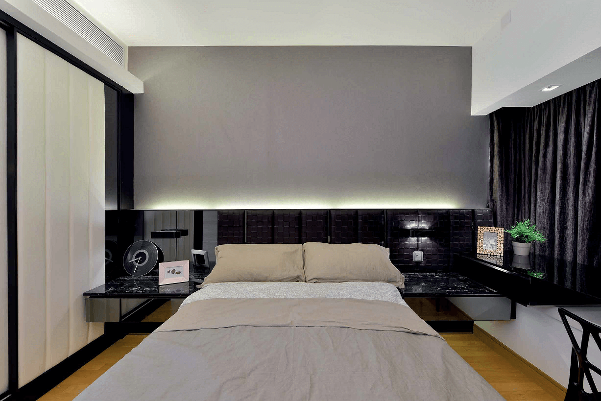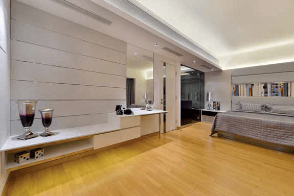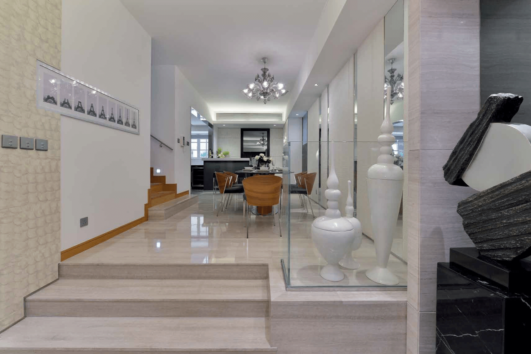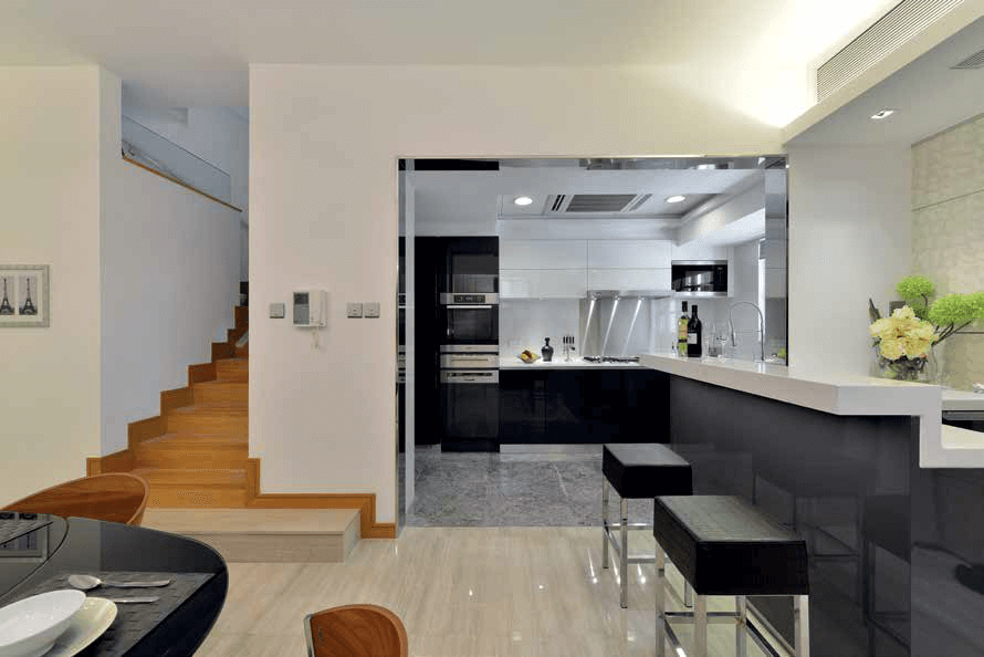 建築師與室內設計師之別?後者角色更能迎合屋主的貼身需要,根據屋主的生活習性重新規劃空間運用,點寸面積用得其所。透過偌大的落地玻璃窗俯瞰開揚景觀,彷彿與客廳連成一體,空間不斷延伸,寬敞舒適;客飯廳以兩級梯級作分隔,原則飯廳略嫌狹窄,設計師跨佔部分客廳空間,將飯廳重新規劃,毗連的廚房牆壁拆掉,改為開放式廚房連吧檯設計,更將通往上層樓梯位置改動,以人為本,打造屬於住客的安樂窩。