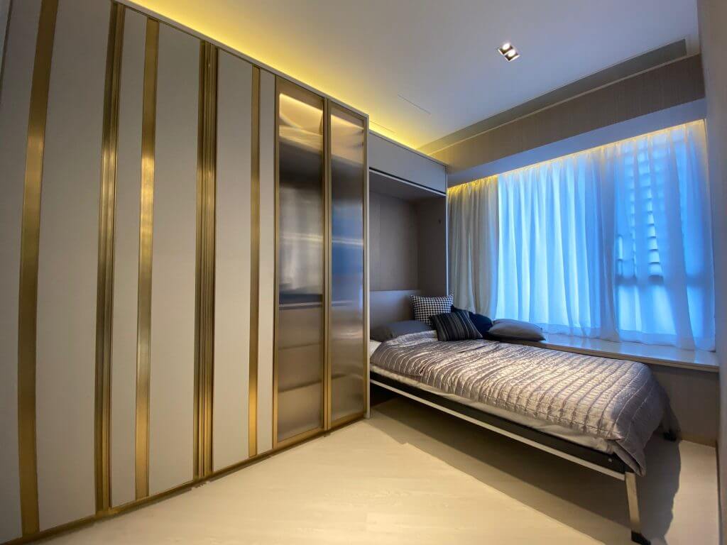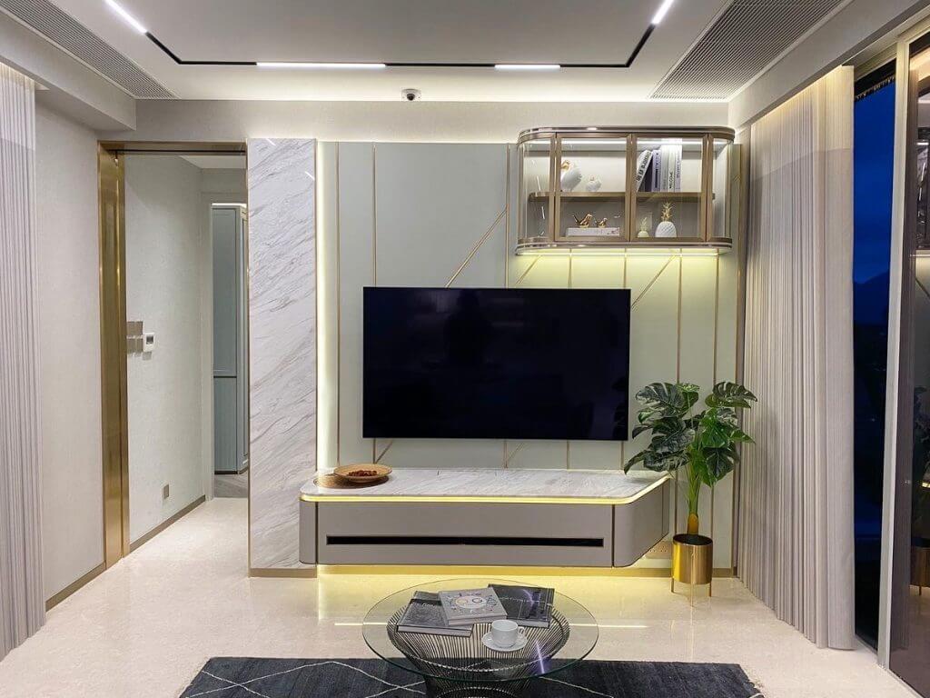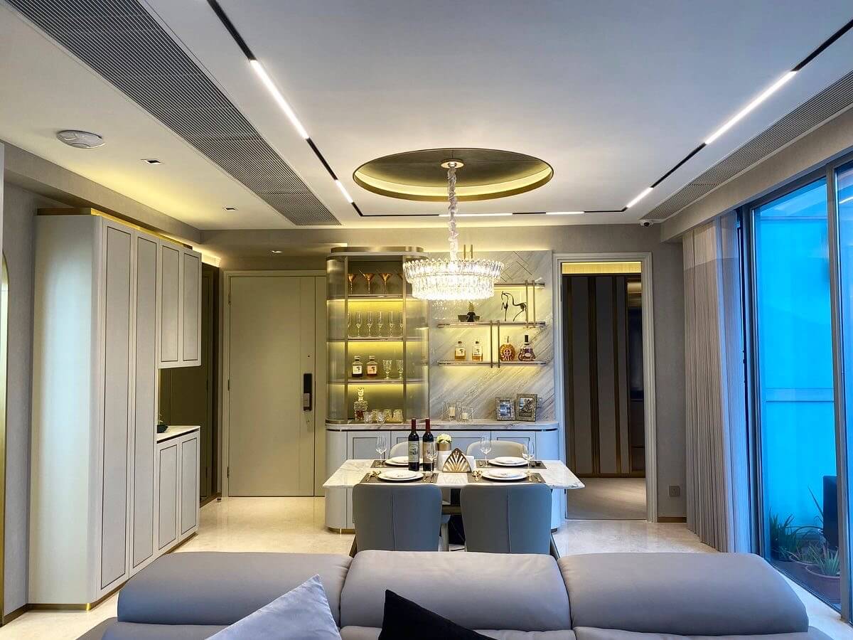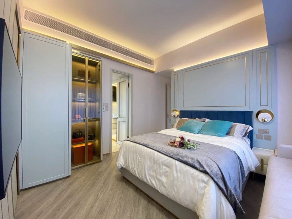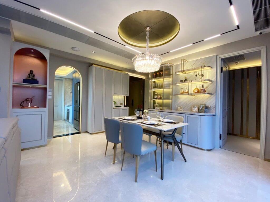 全屋貫徹淺粉綠色為主色調,用雲石、淡香檳金色及金屬質感等物料,配上不同大小的掛件及水晶燈,增強單位時尚感及視覺效果。