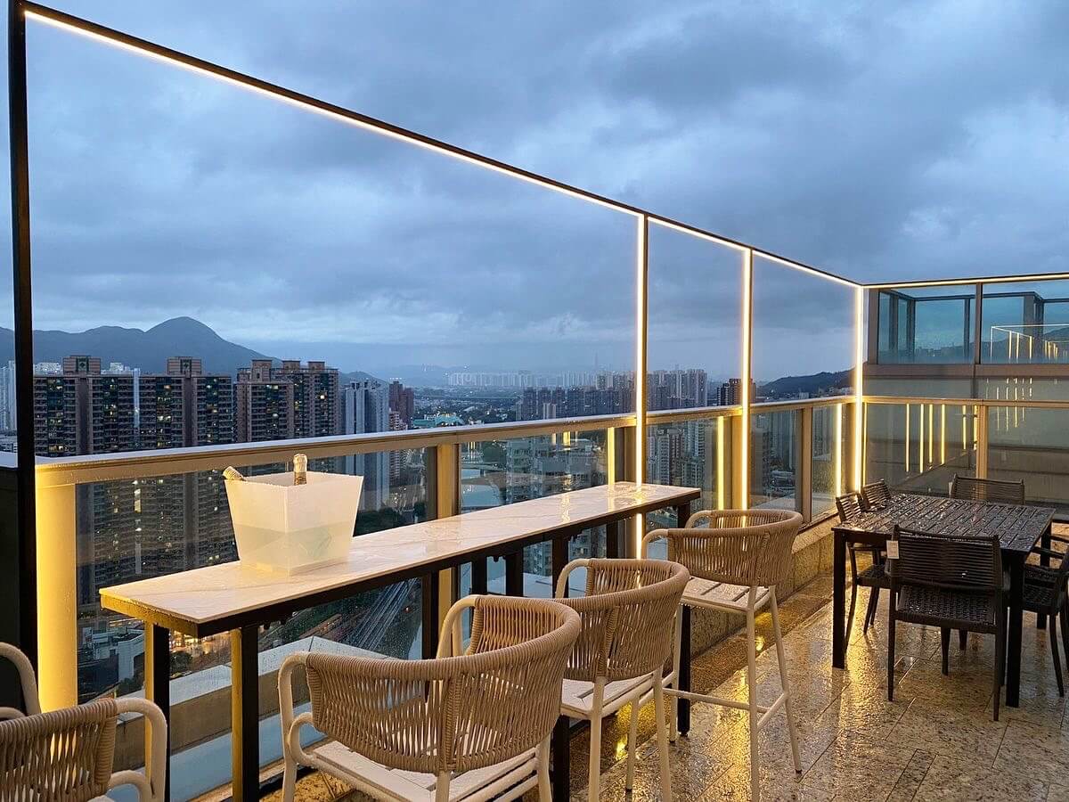 其中一邊露台擺放吧枱及大型餐桌,加設獨特設計戶外燈架,方便屋主遠眺景觀及招呼親友享樂燒烤,在百忙之中增添一份閒情逸致。