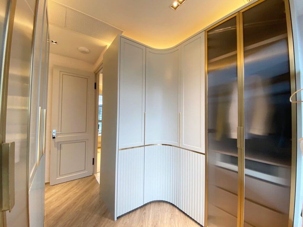 一進屋內,一幅簡約特色玻璃鏡面,雲石台面及鞋櫃兼有淺黃滲光,打造成一個古典味道玄關;