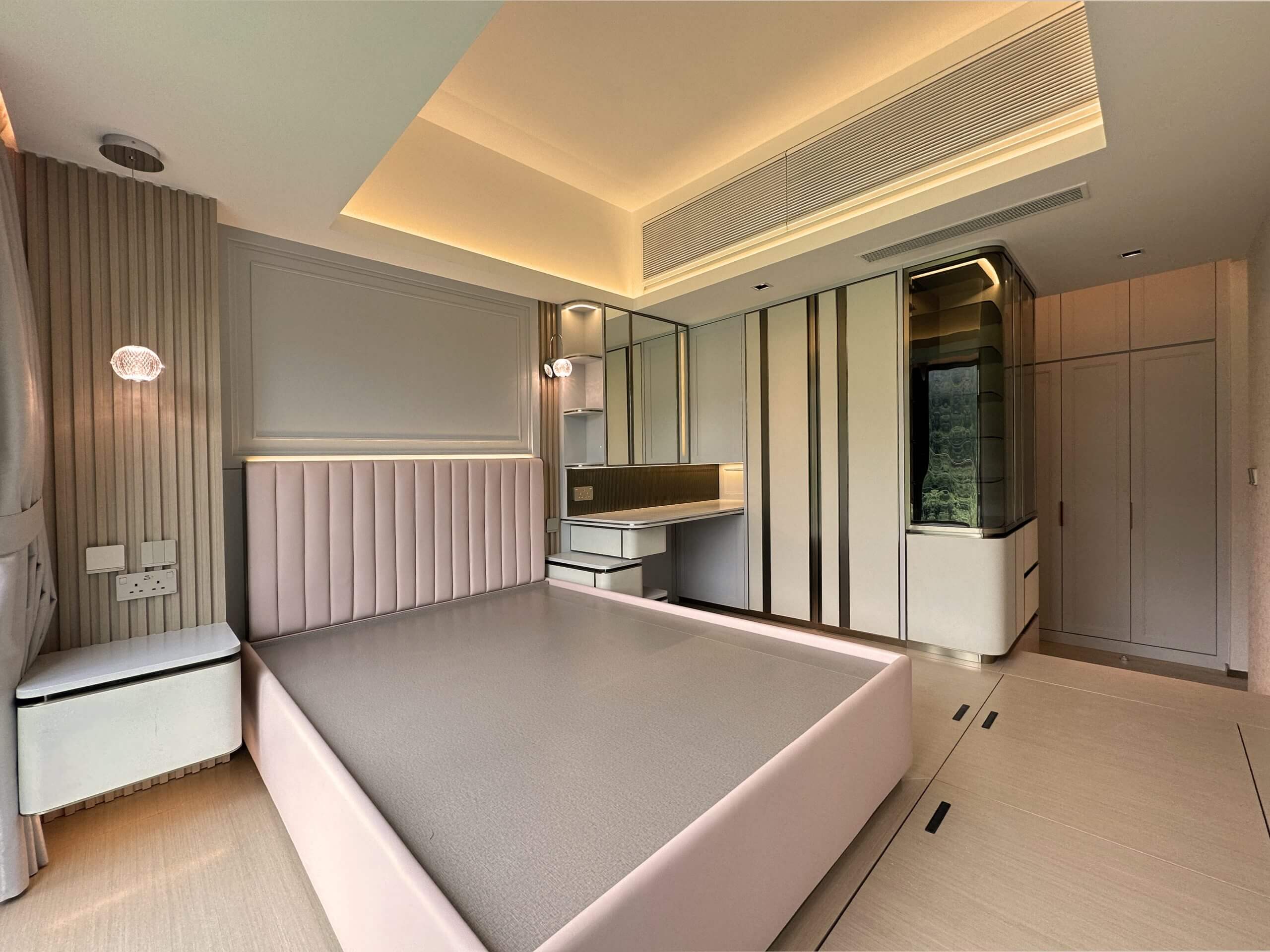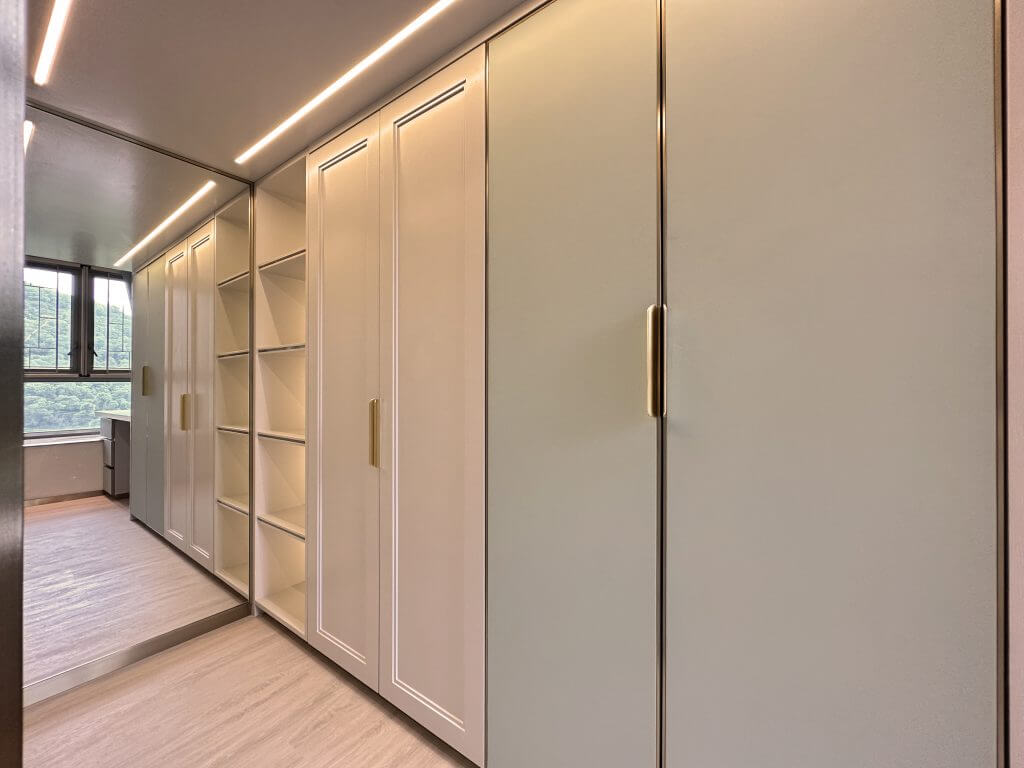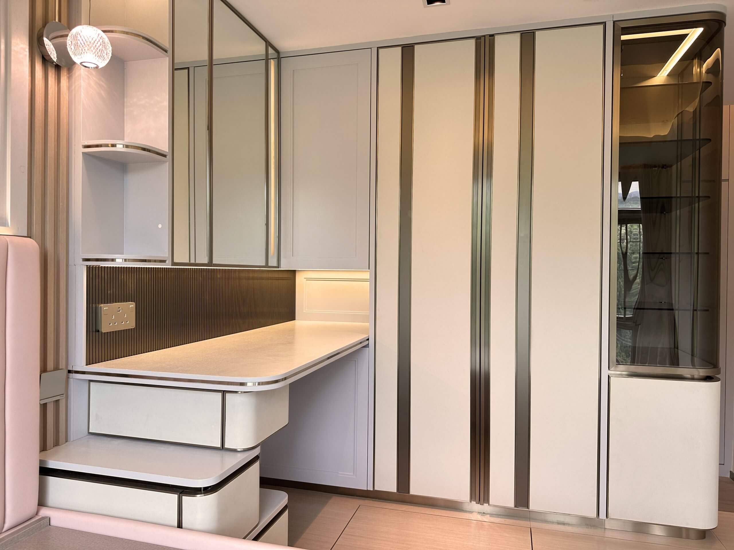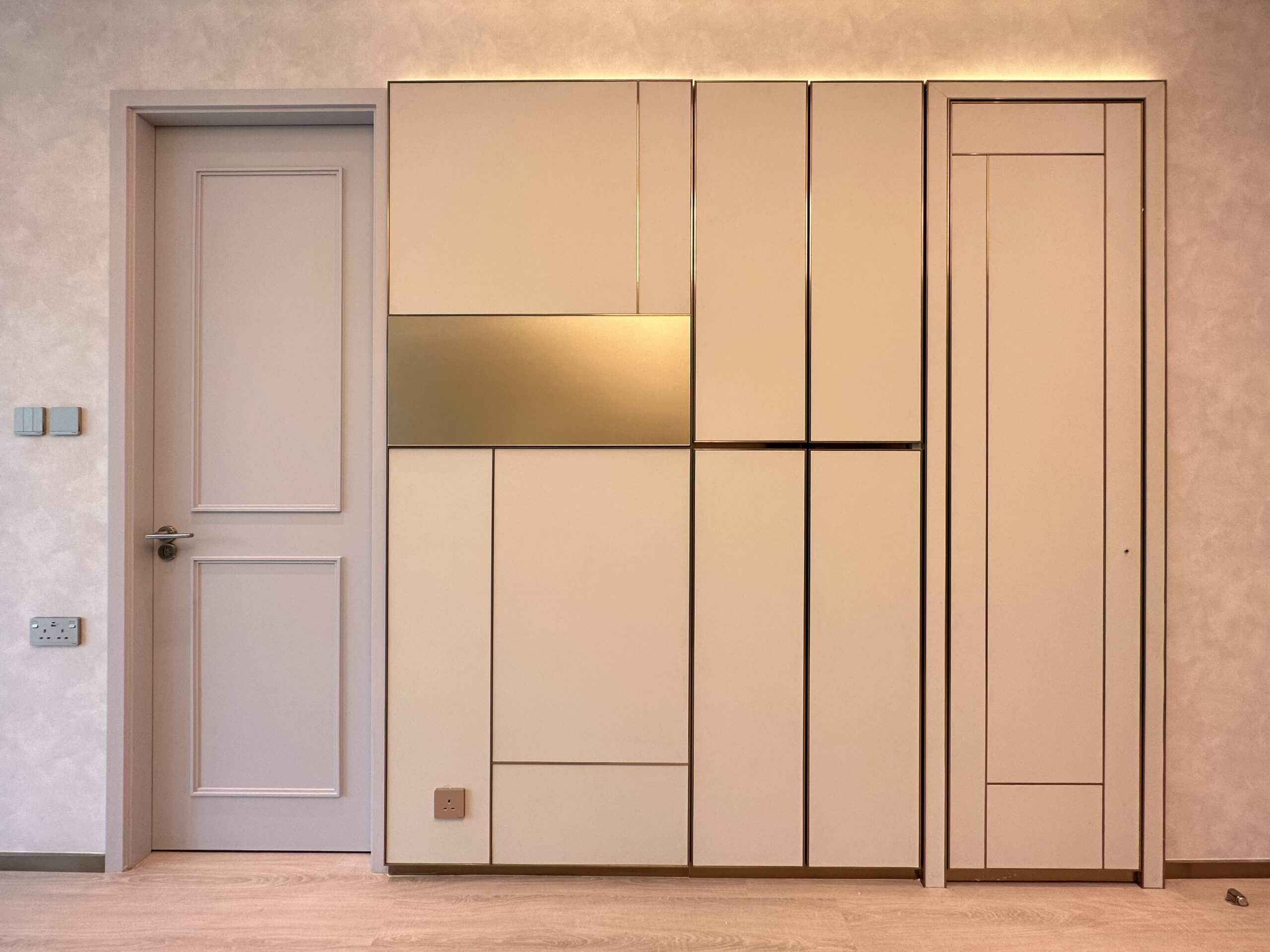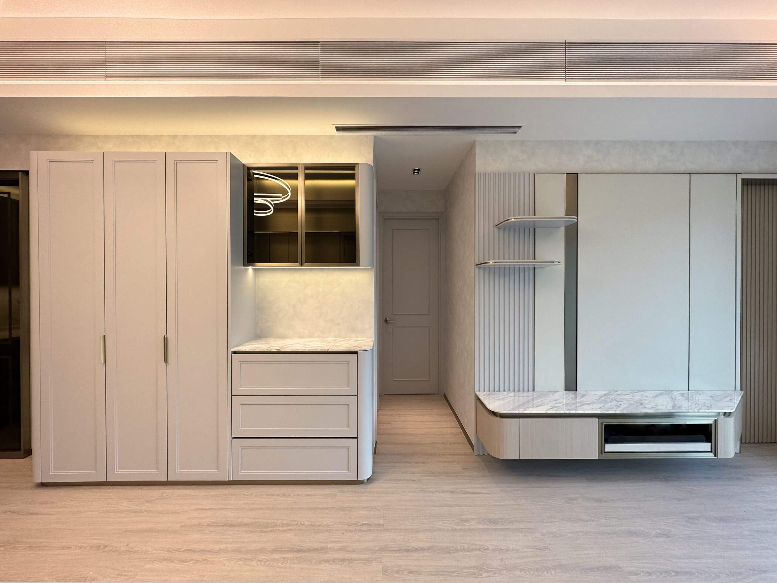 全屋採用現代簡約風格结合輕奢設計為主題,以暖色系、淺色及米色為主調、運用不同的簡約線條及部份位置使用香檳金鋼點綴