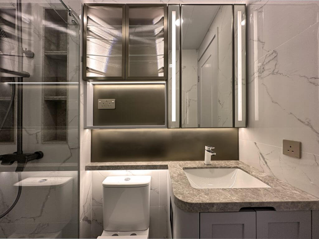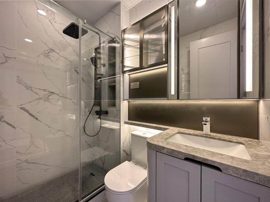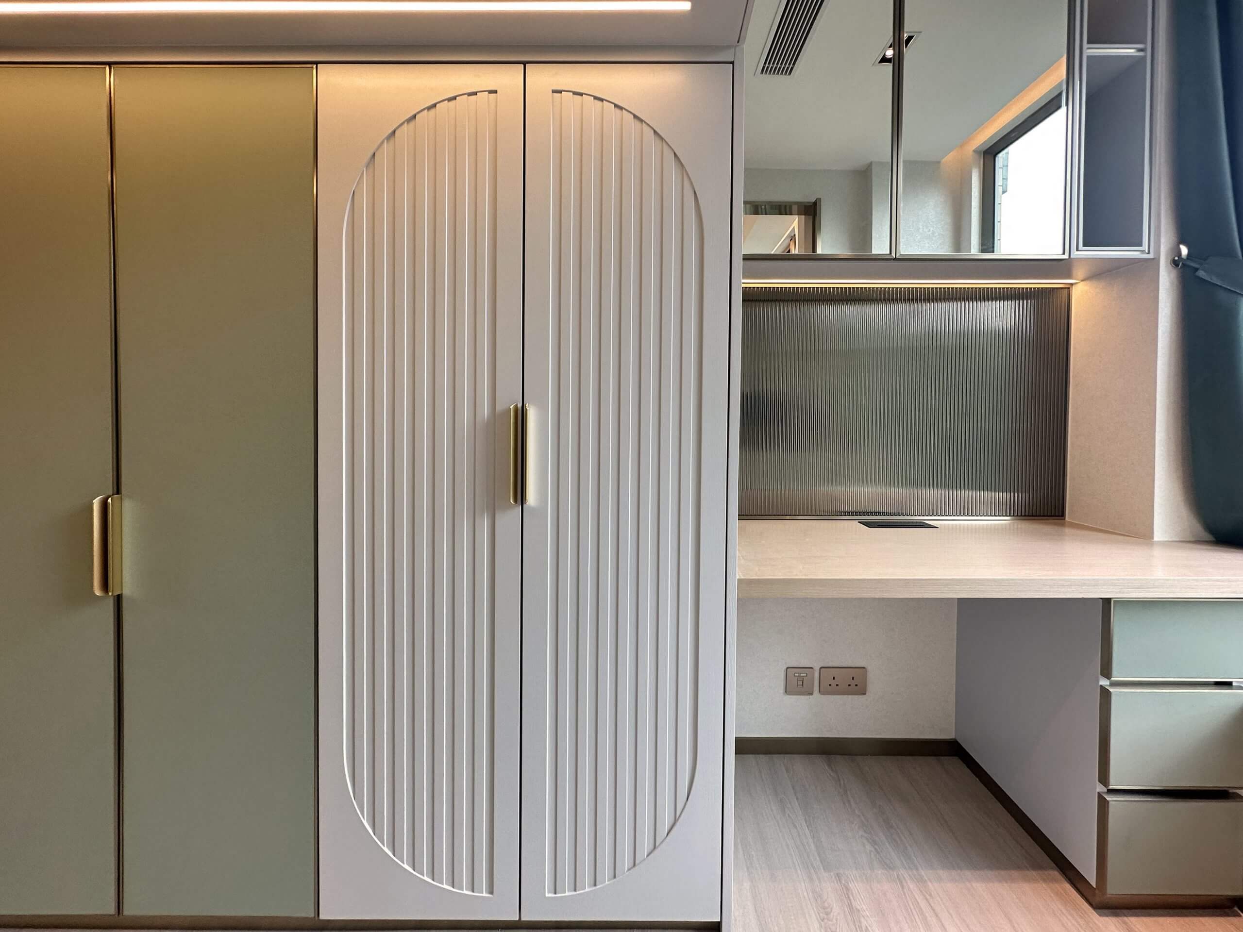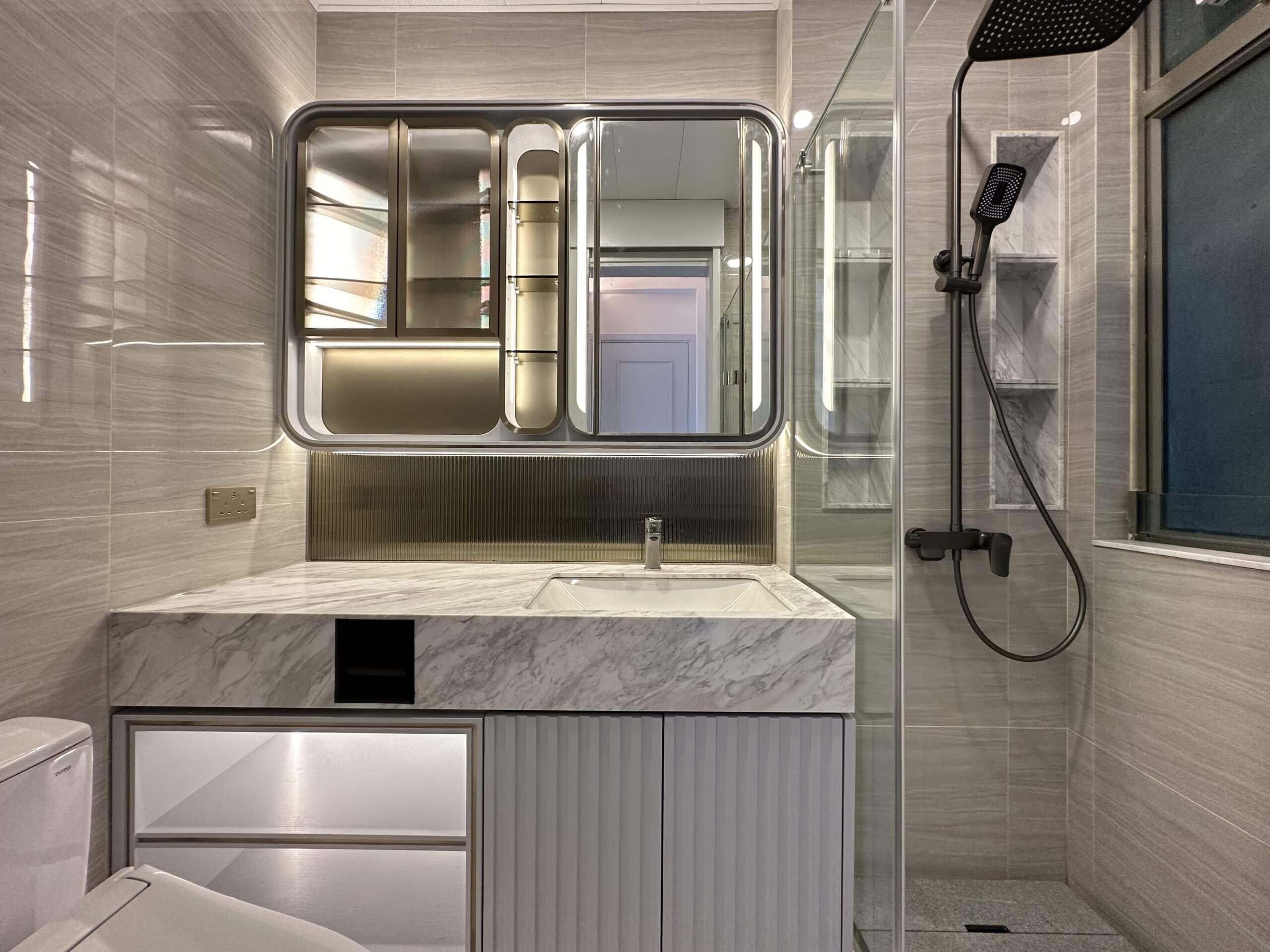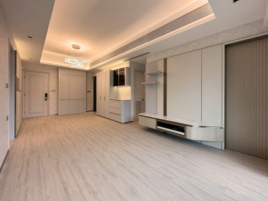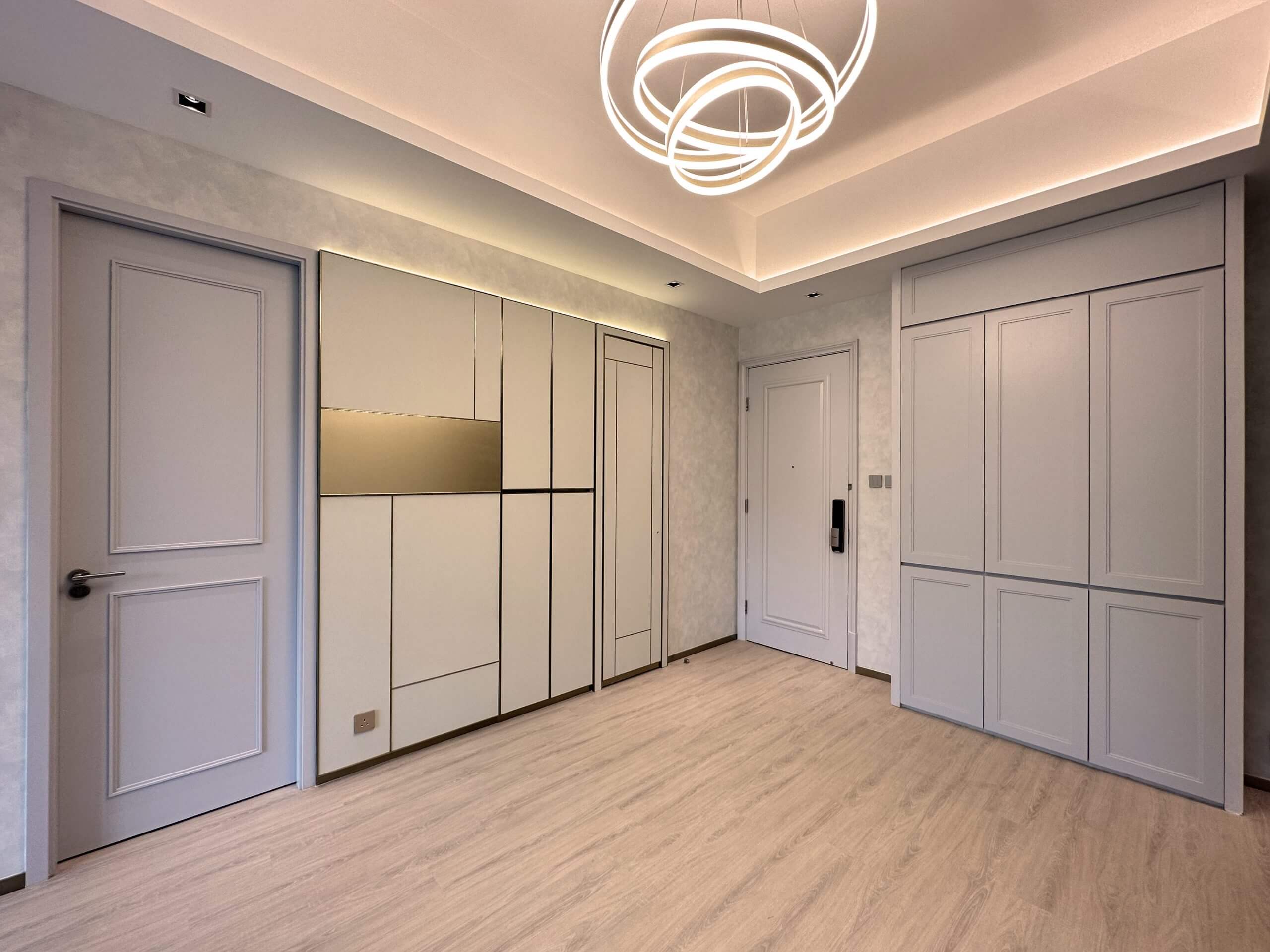 全屋採用現代簡約風格结合輕奢設計為主題,以暖色系、淺色及米色為主調、運用不同的簡約線條及部份位置使用香檳金鋼點綴