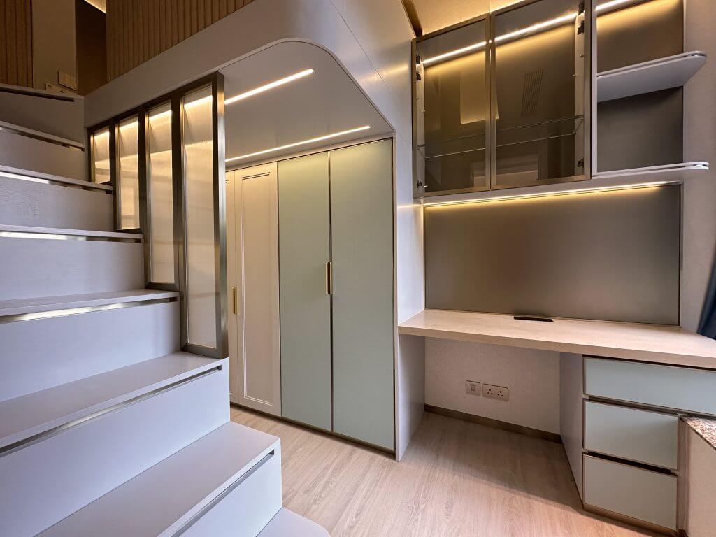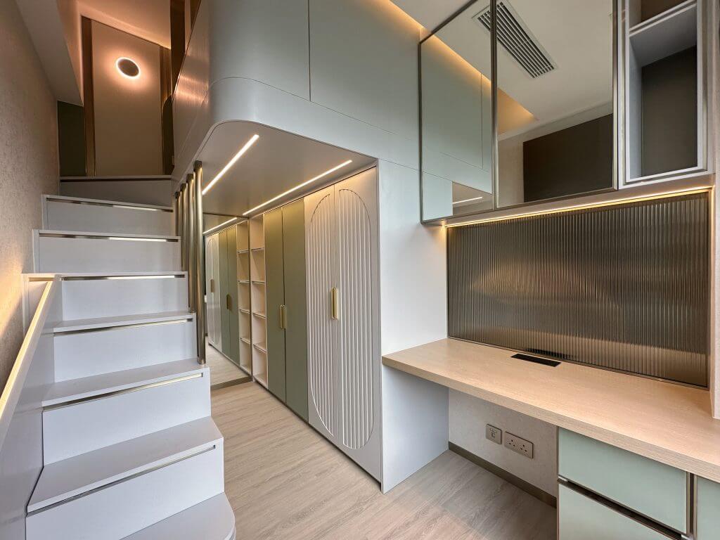 令整個房間充滿溫暖與愜意。白色樓梯儲物櫃加以金鋼點綴,扶手巧妙的利用金屬線條裝飾等,
