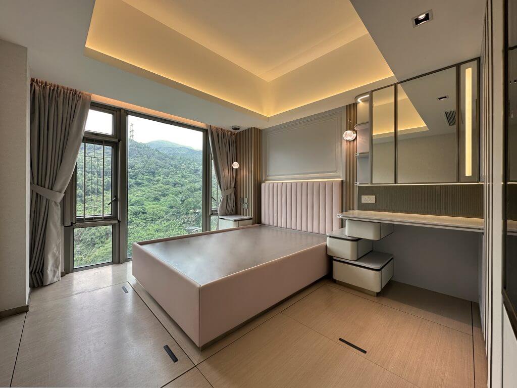 區別於以往的米色,鉛灰色調,這次設計師大膽採用淺綠色作為臥室設計的主要色調,把窗外大自然氣色引入室內,讓生機引入日常生活當中。