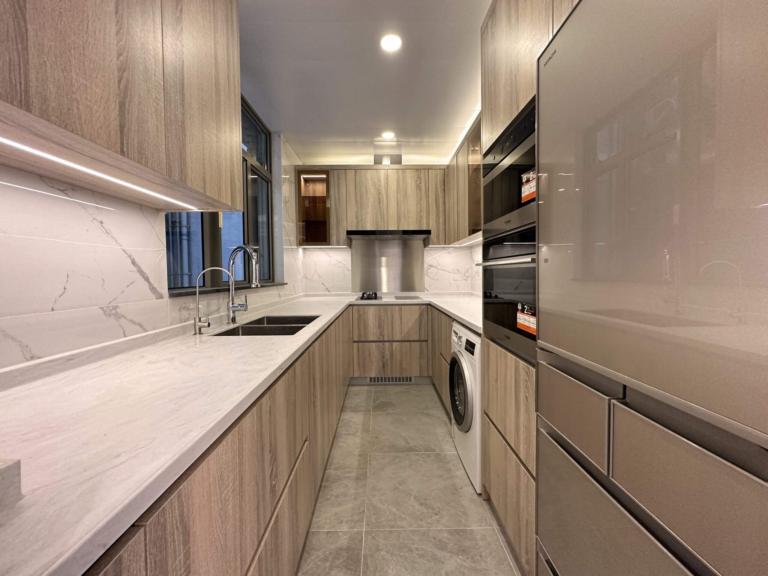 飯廳位置通過木材和金鋼以及少量雲石、不同材質的線條互相碰撞,令到與淺色櫃面達到一種既和諧也統一設計效果。
