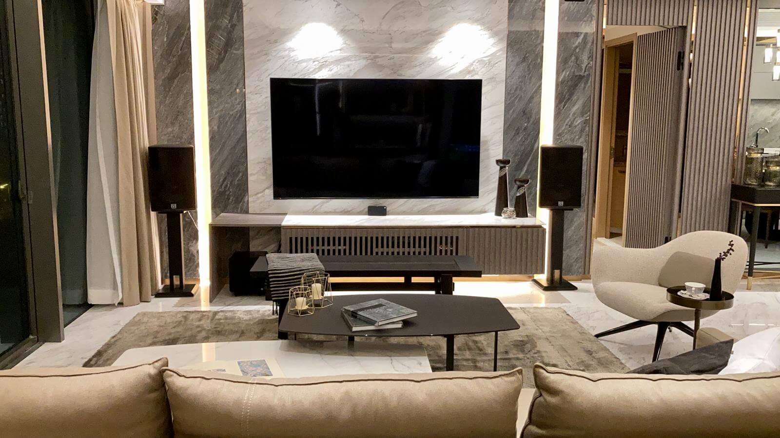 客廳電視特色牆的白色大理石搭配淺色的紋理和簡單的電視櫃,讓整個客廳都變得更為簡潔、大方。除了雲石之外,在電視特色牆的兩側加上了木條子的飾面板及金鋼條,配合天花的射燈作為點綴,提升了整幅電視牆的顏值,點亮了雲石牆的設計,營造出既沉穩又高貴的格調。。
