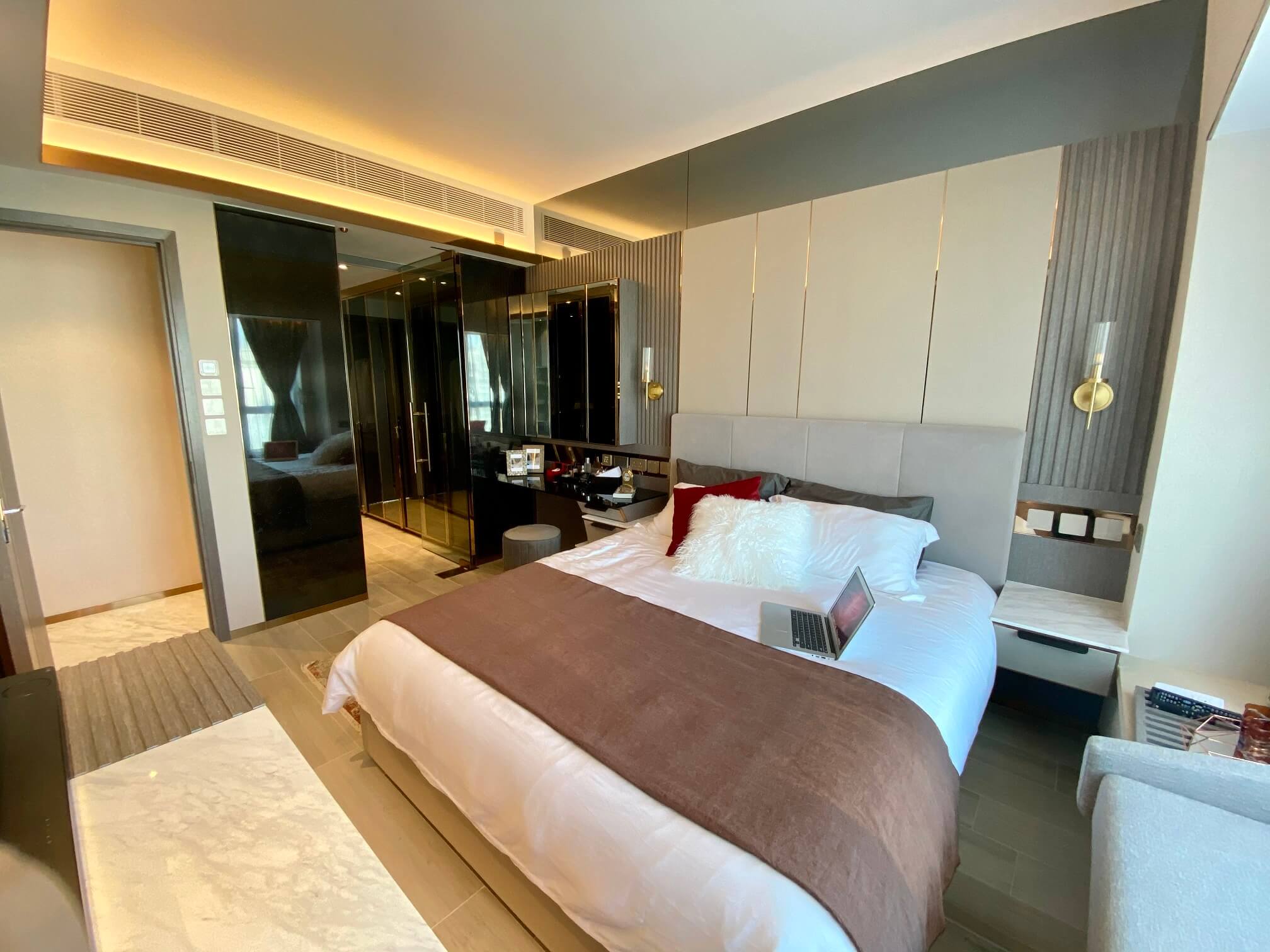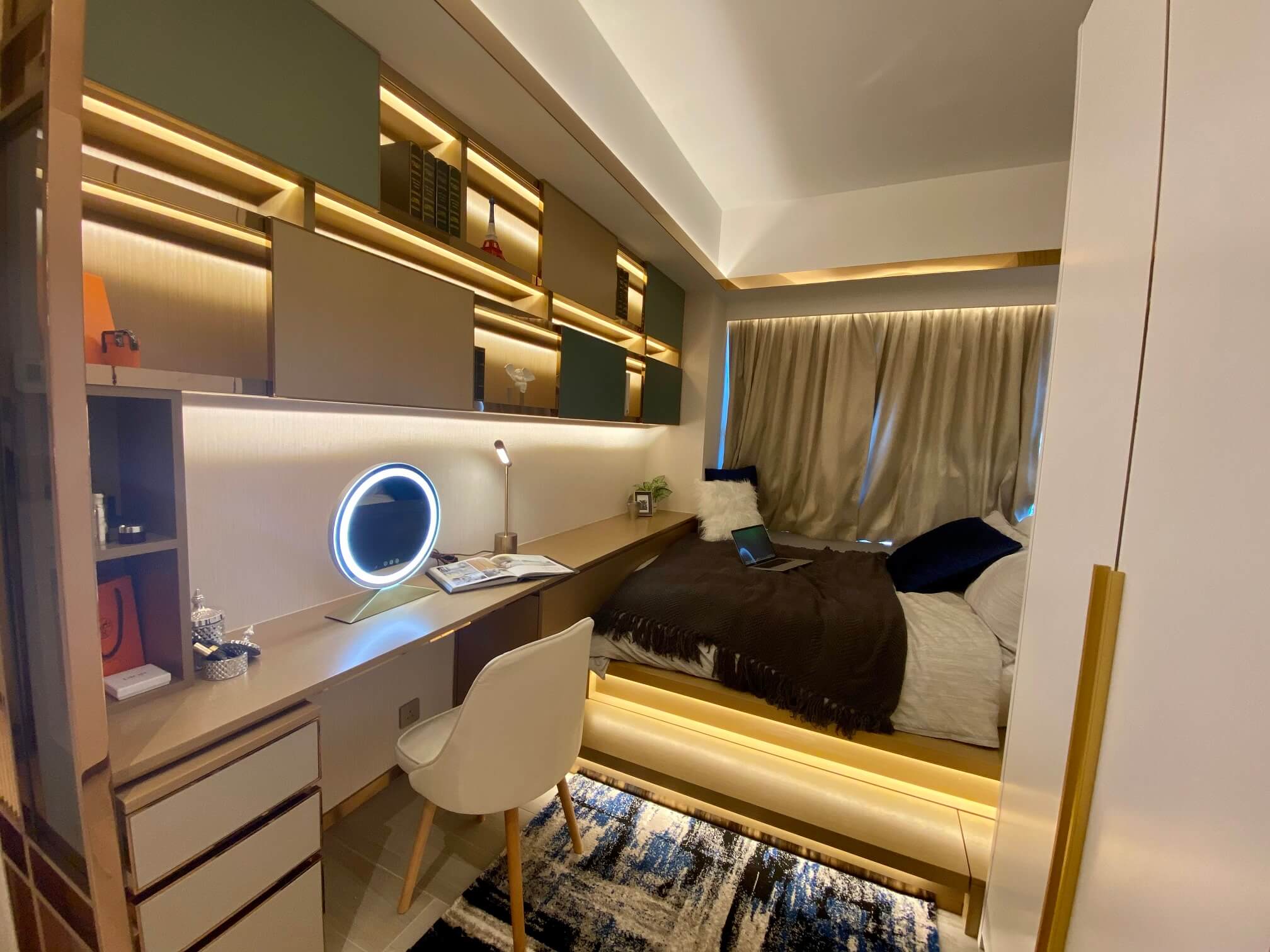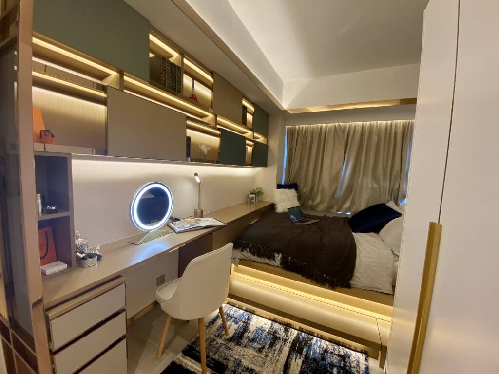 不只是電視特色牆,設計師在客飯廳的地面的設計也選擇了鋪設雲石,明亮的雲石帶著簡單的紋理,和牆面的雲石相互呼應,加上雲石紋的茶几及餐桌,為單位帶來了更為整體的感覺。與此同時,單位內的床頭櫃和展示櫃的檯面亦運用了大理石呼應全屋,大面積的運用雲石,也是現代風中常見的設計,大氣而又時尚,豐富整間屋的細節。