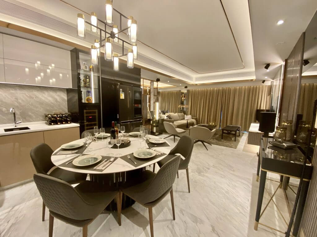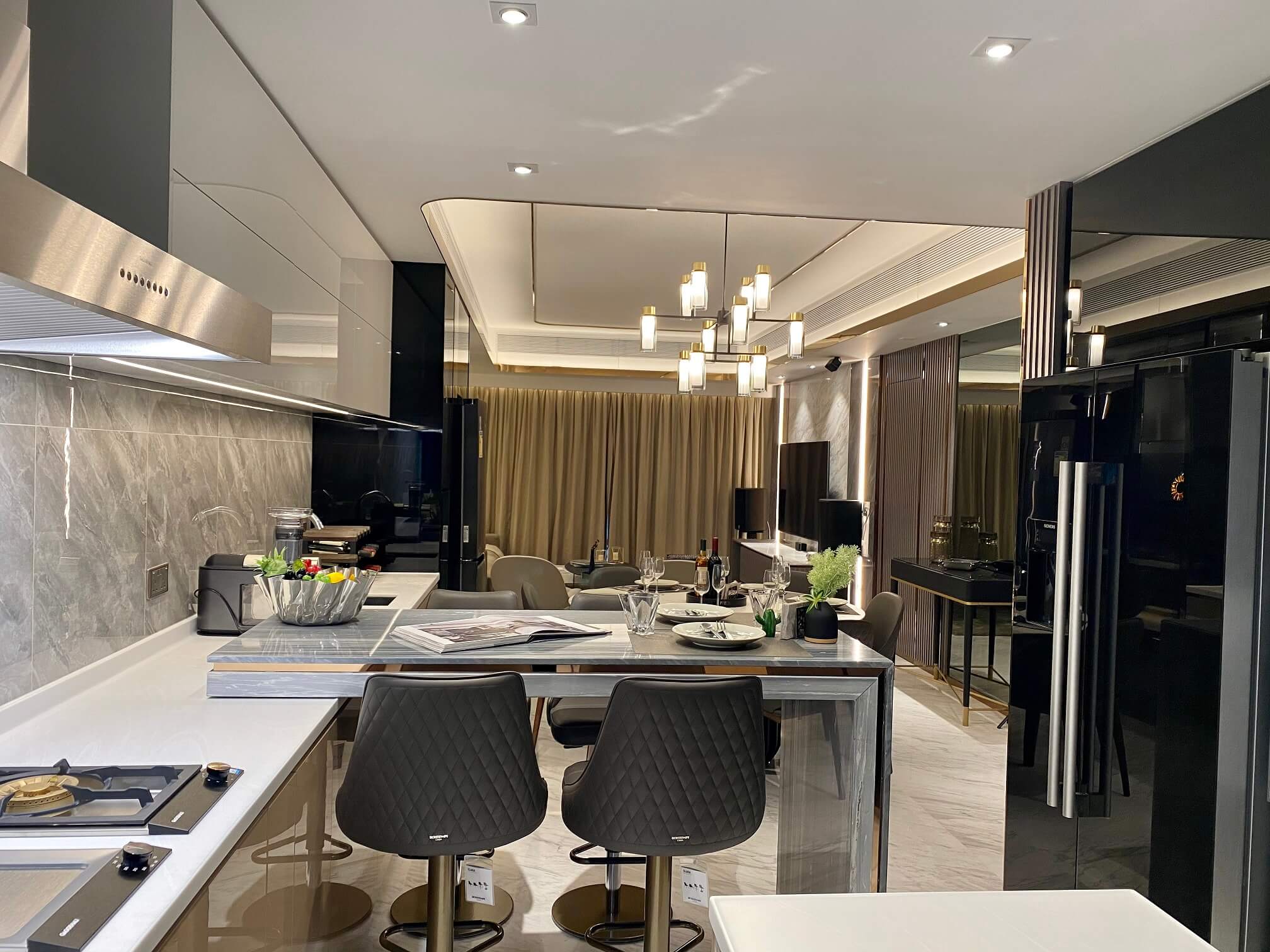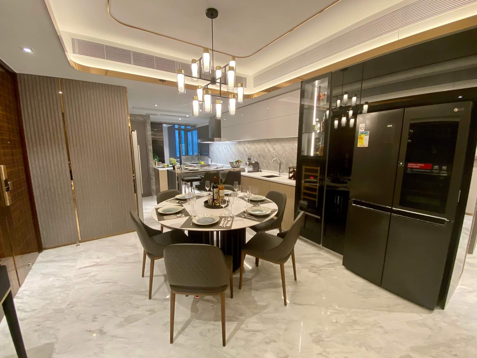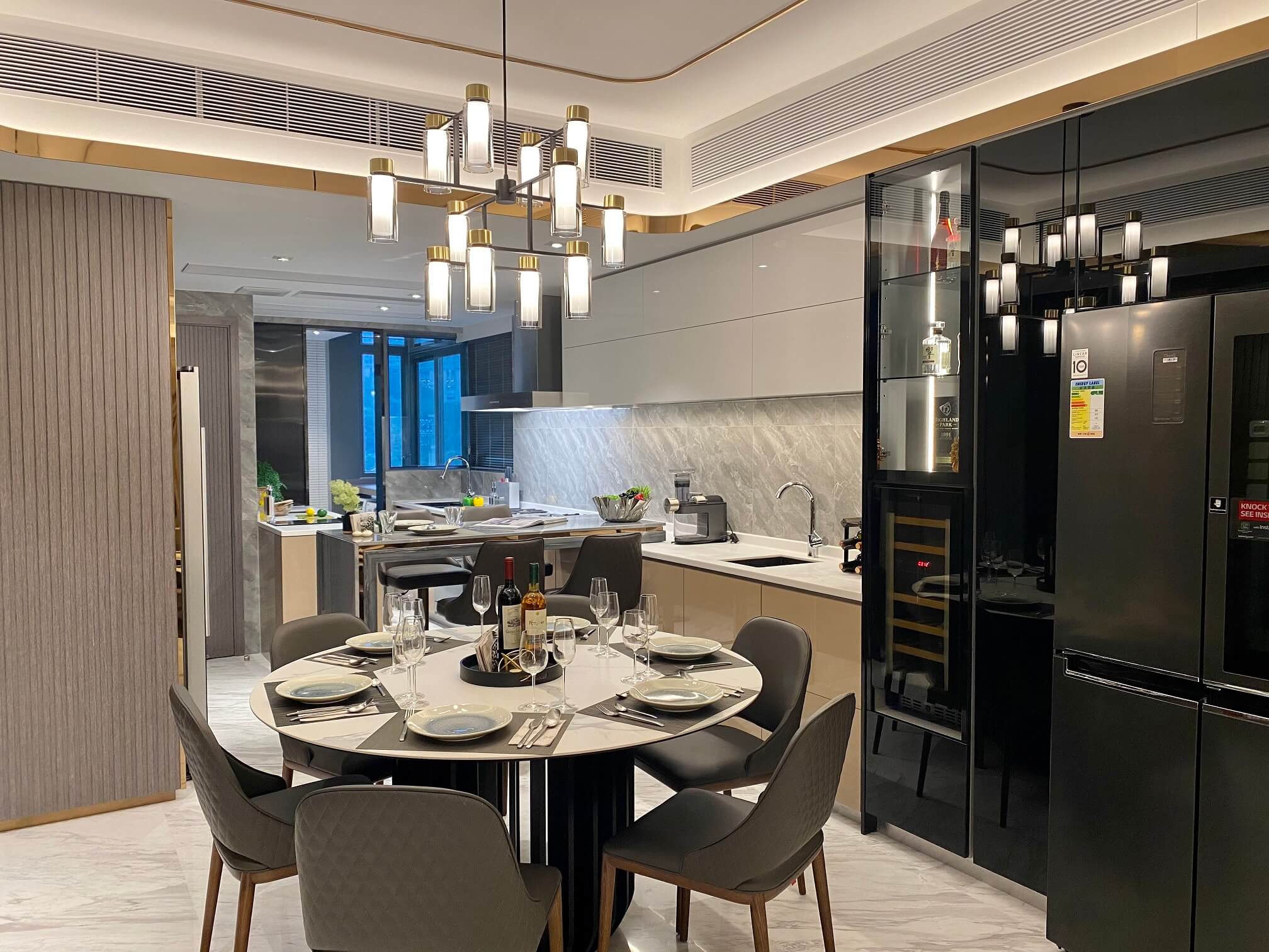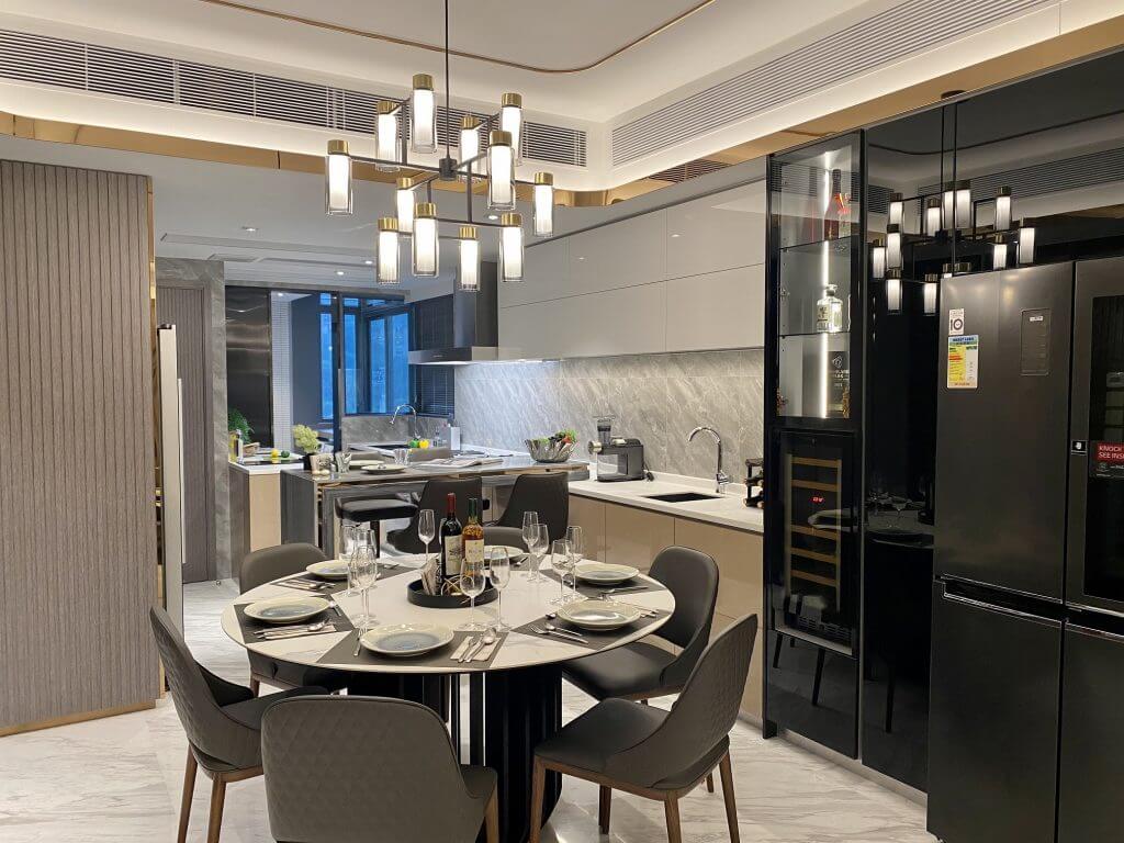 飯廳的吊燈亦同樣使用了玫瑰金鋼,豐富整個住宅設計的細節。