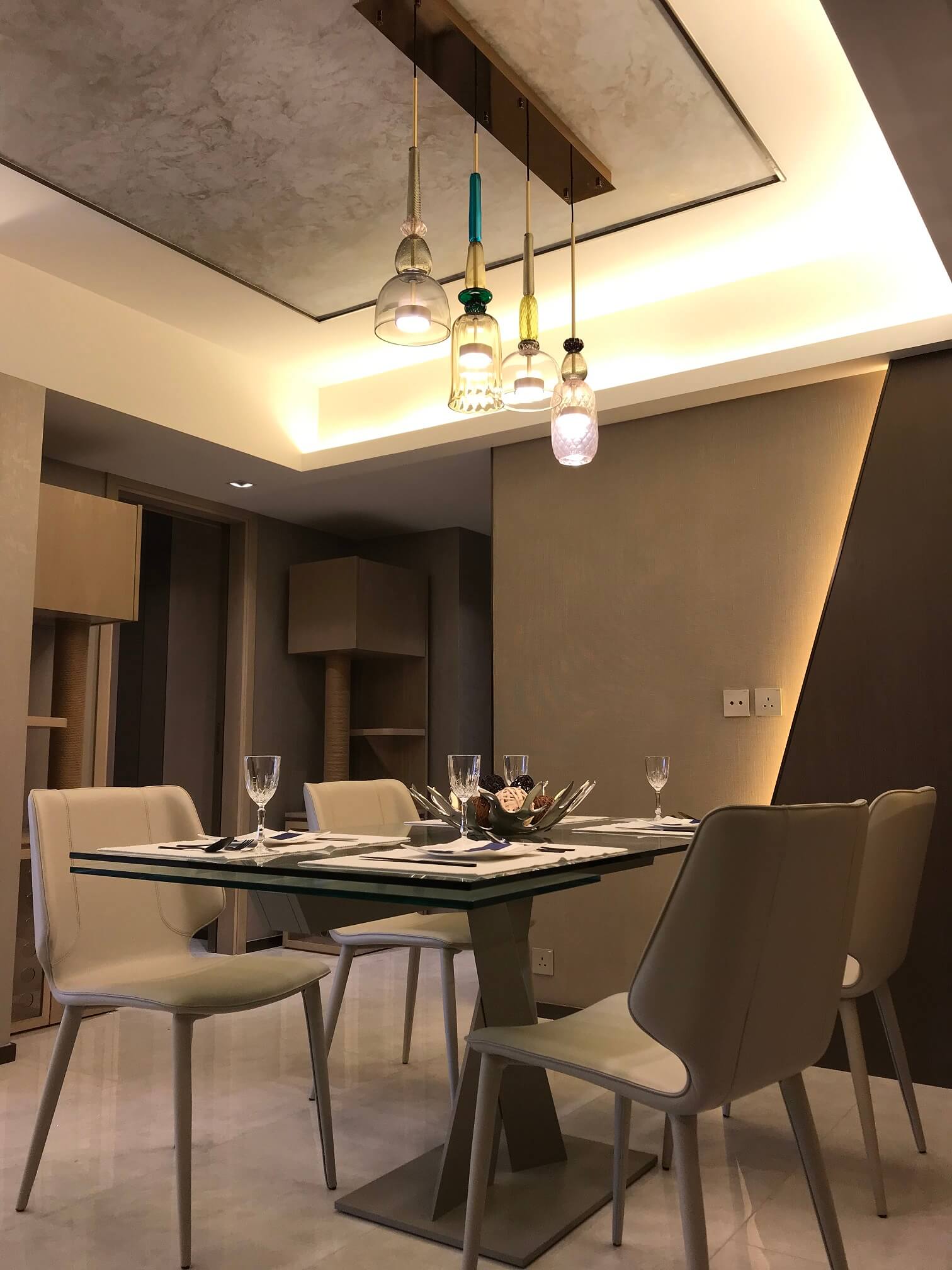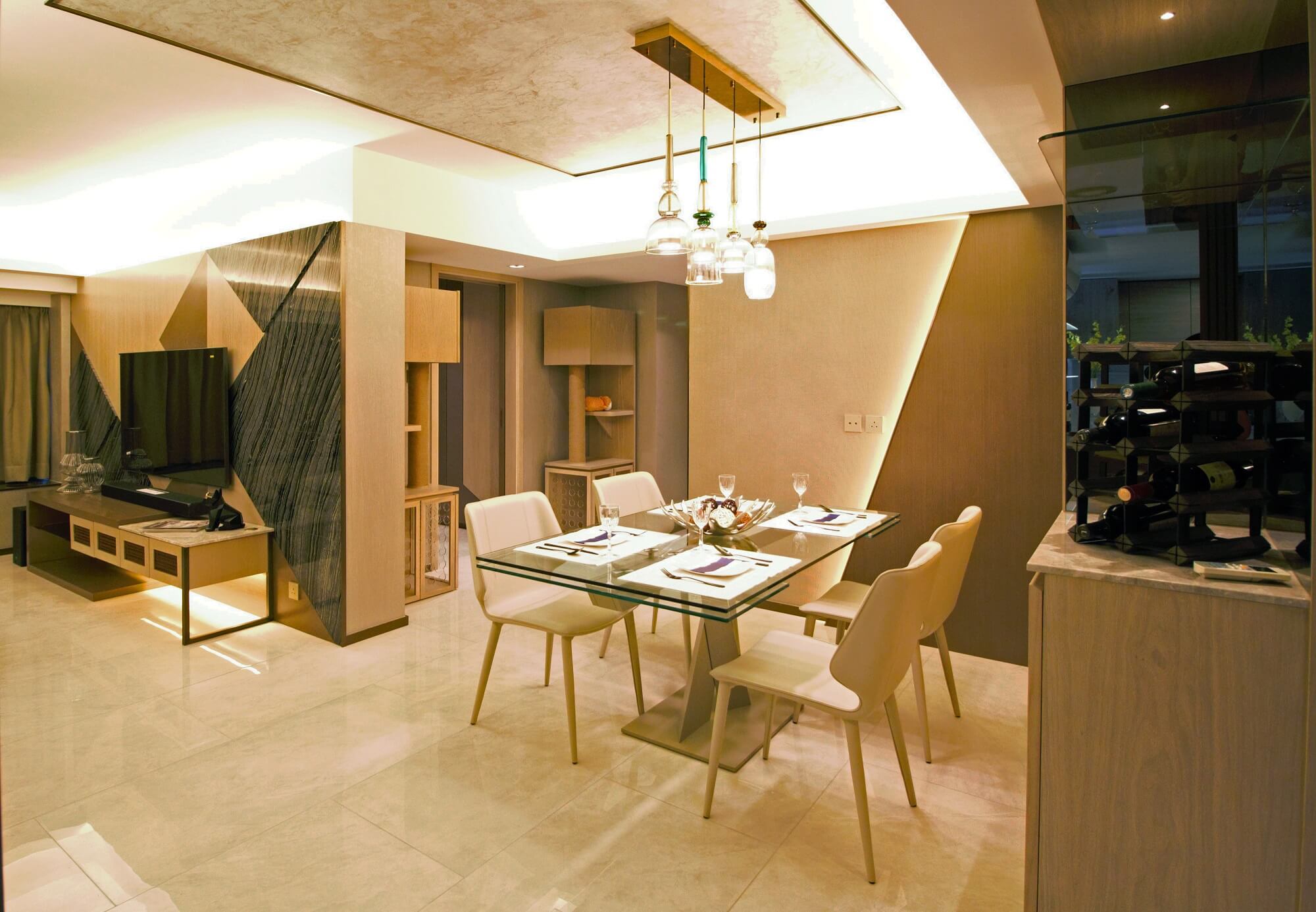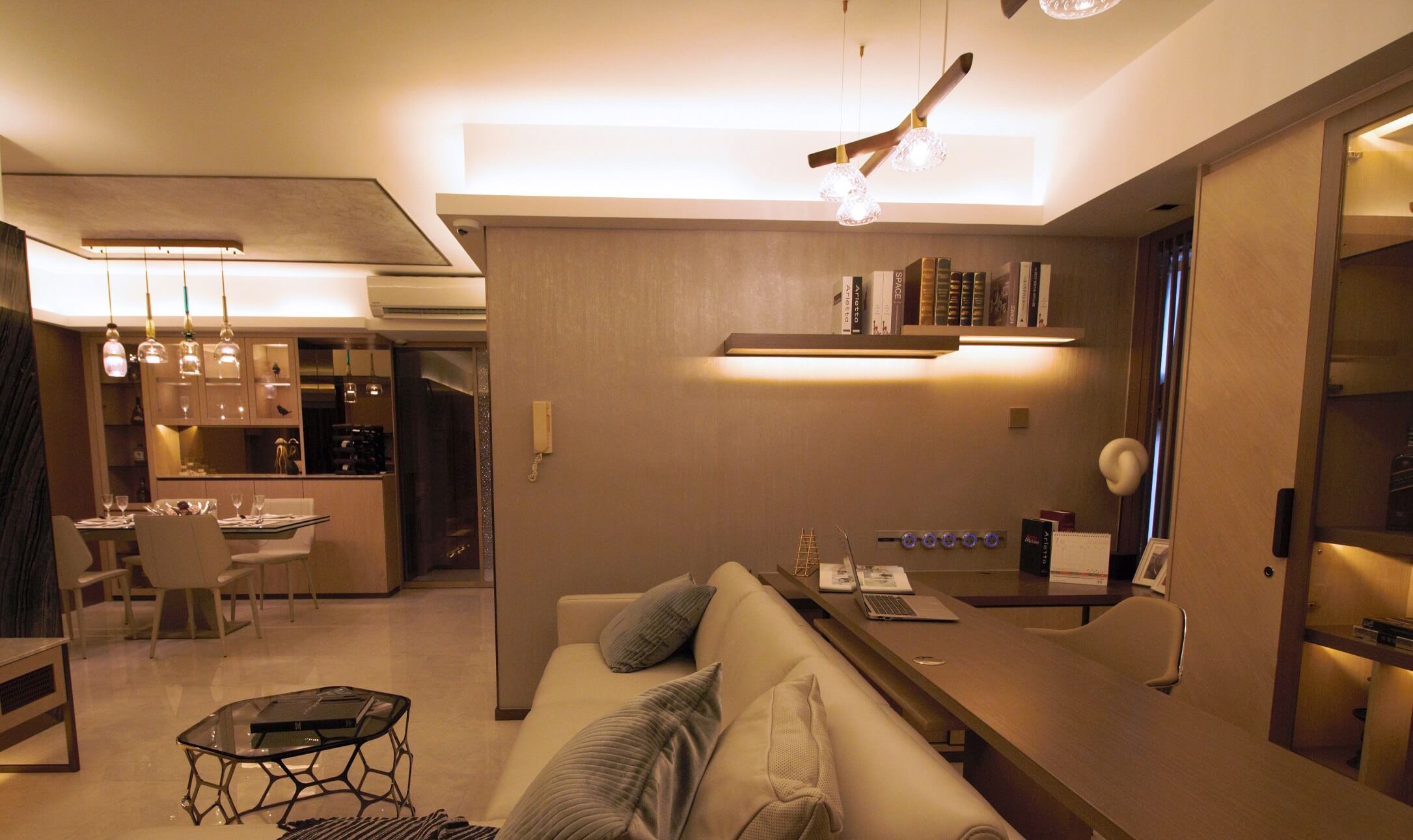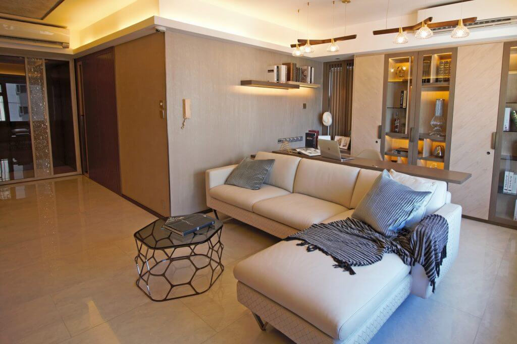 由於業主有養三隻貓,Eric 今次要為人與貓主子度身訂造,客飯廳多處採用幾何圖案,為了男業主有更多時間陪同愛妻今次的項目採用了開放式書房,大廳沙發背後就是書枱。
