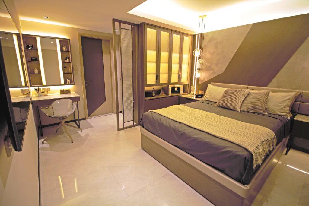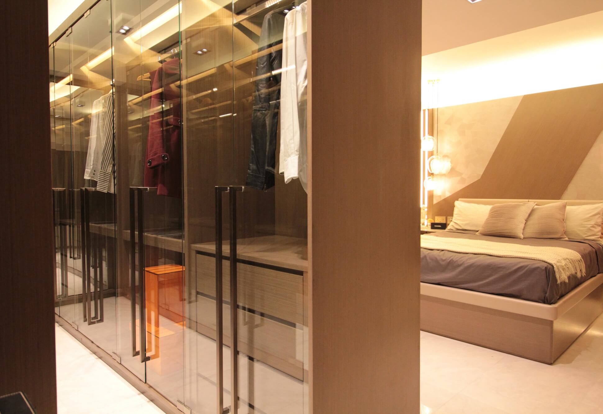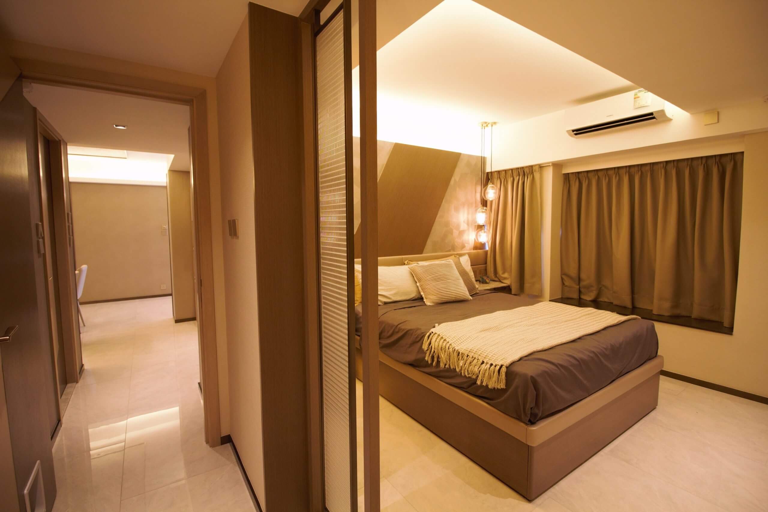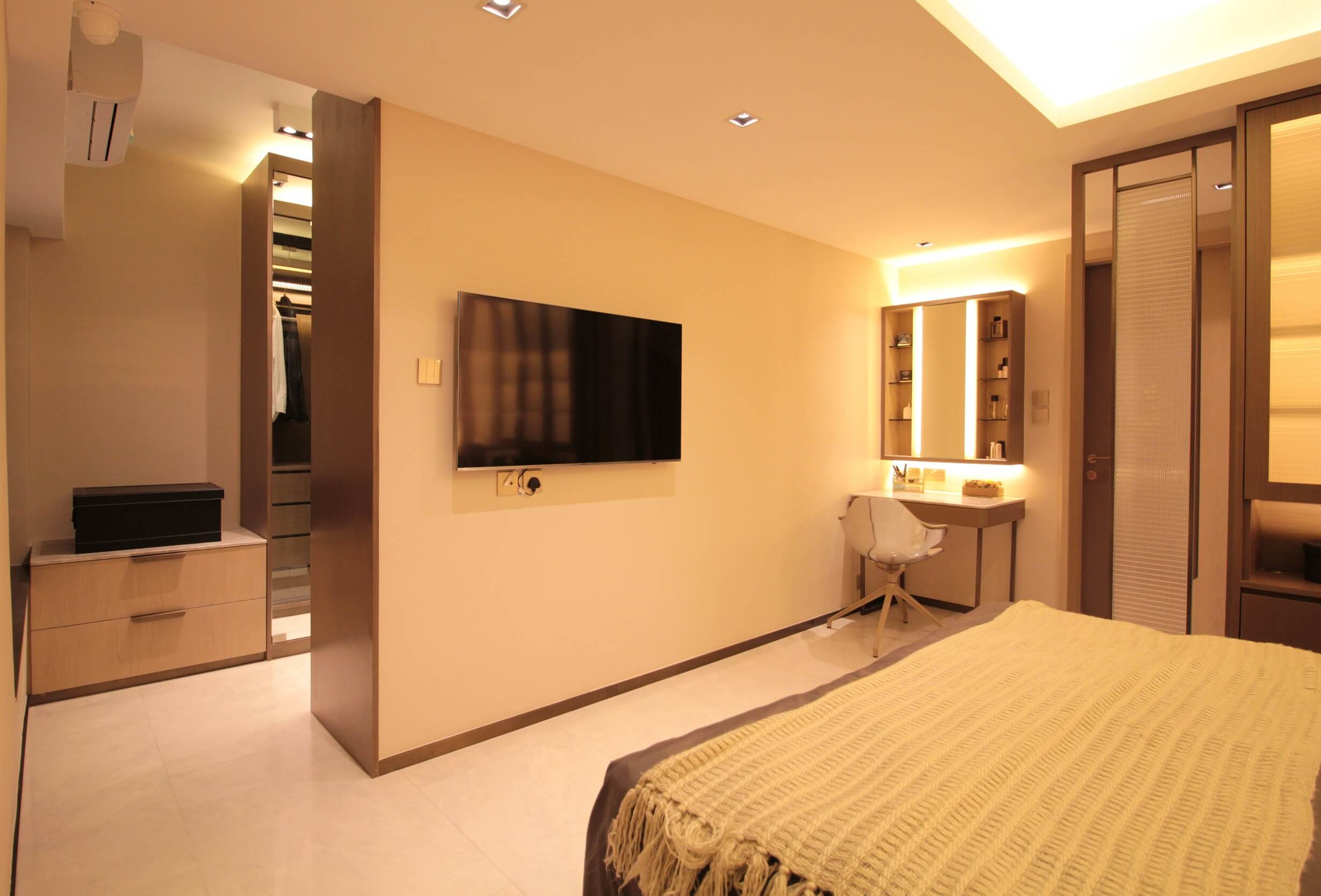 由於業主有養三隻貓,Eric 今次要為人與貓主子度身訂造,客飯廳多處採用幾何圖案,為了男業主有更多時間陪同愛妻今次的項目採用了開放式書房,大廳沙發背後就是書枱。