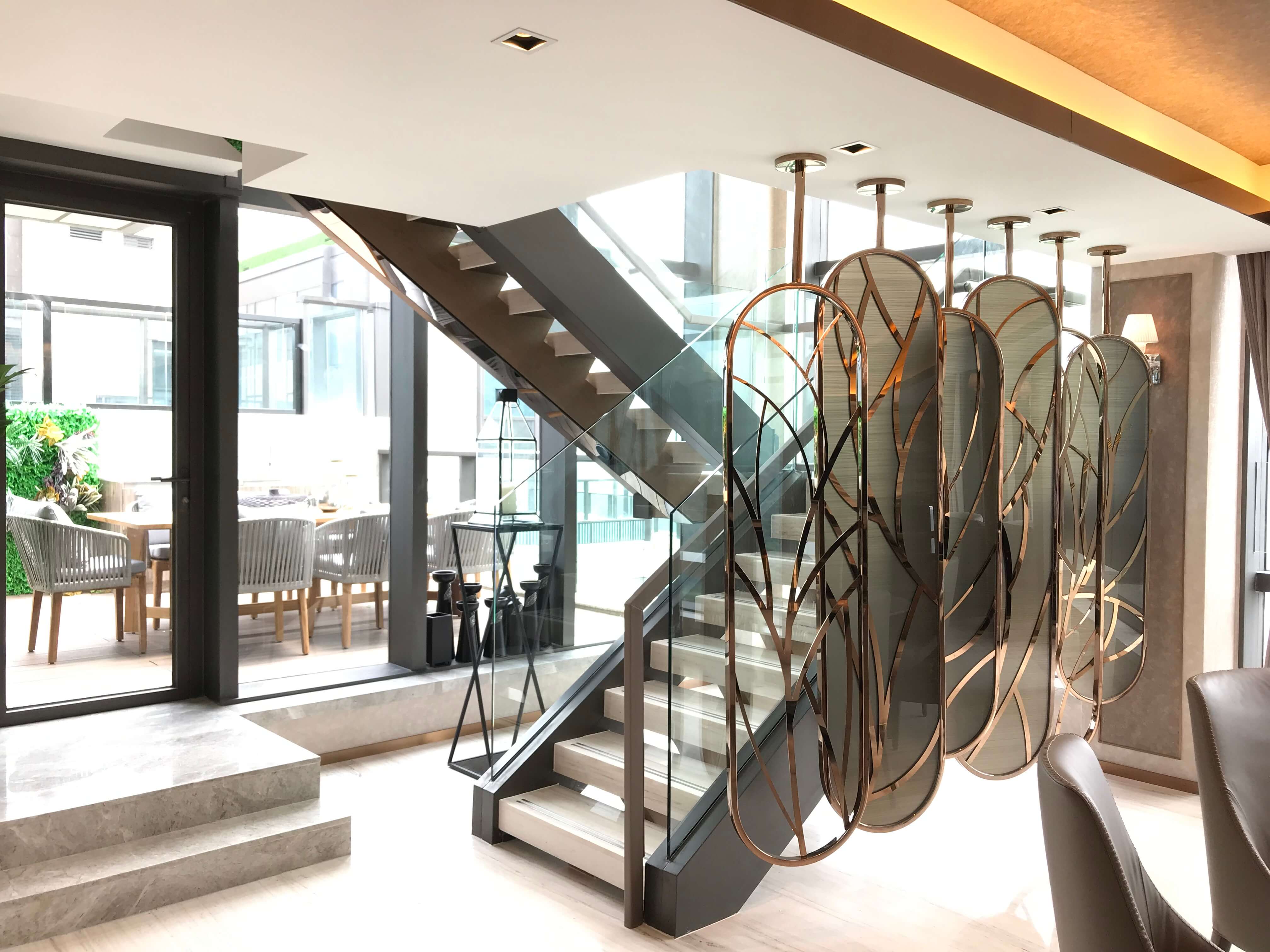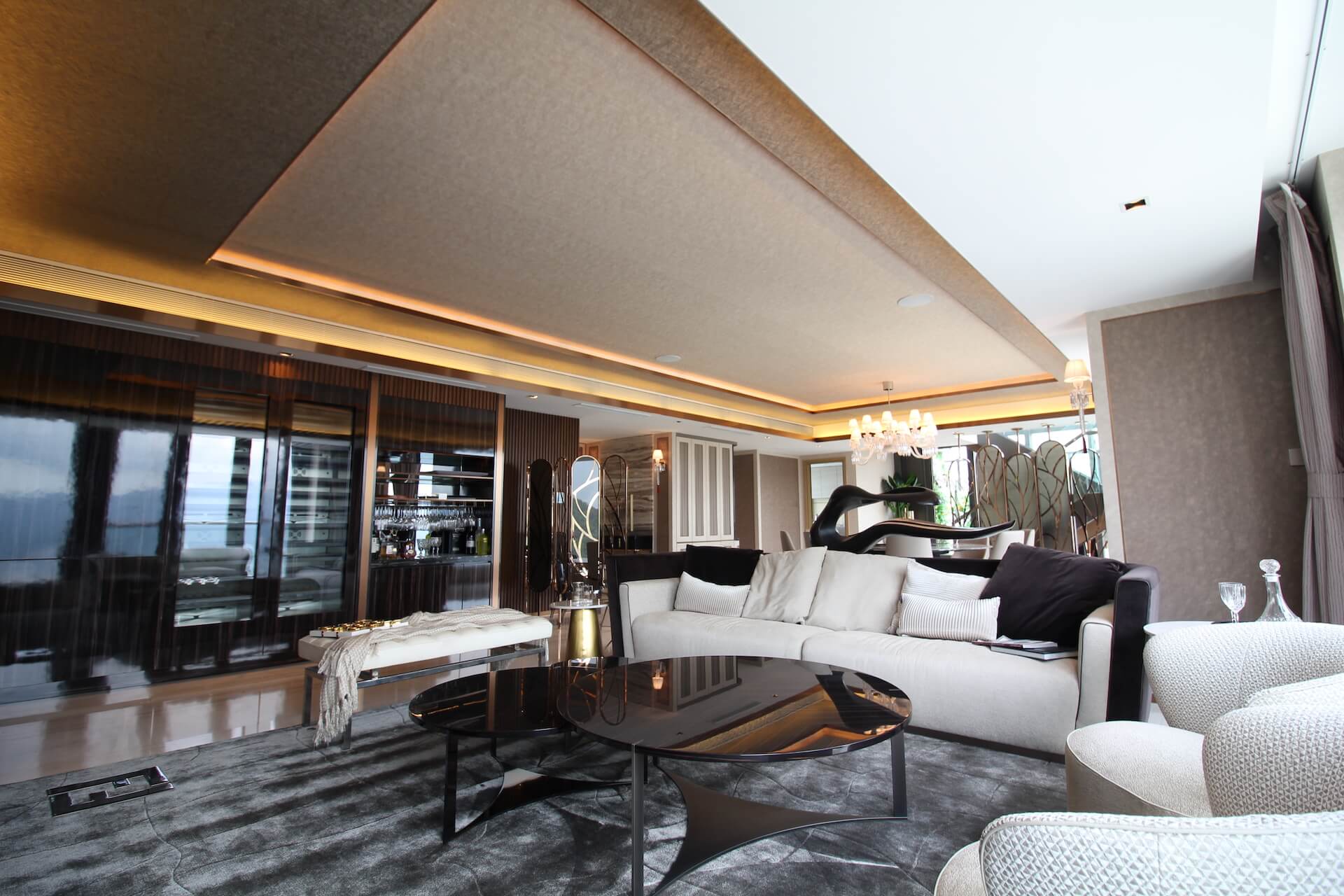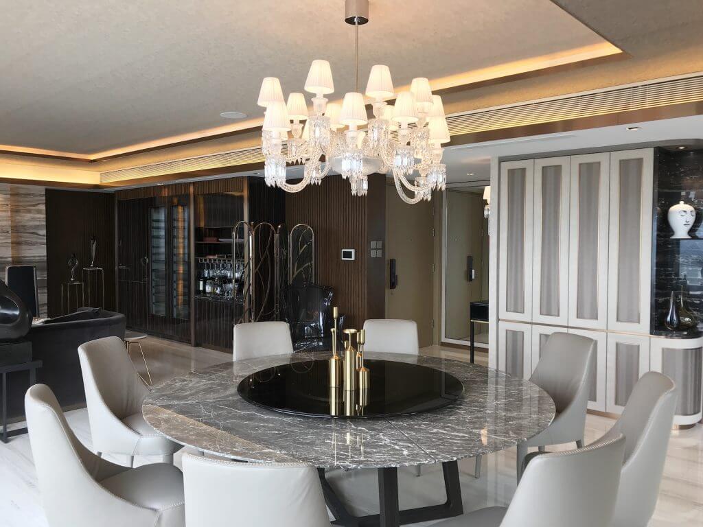 寬敞的空間與優雅的風格是理想搭配,白金沙石地台在陽光照射下隱約閃爍著星點亮光,玄關旁一幅啡金沙雲石牆以及一對Baccarat壁燈,配合飯廳的水晶吊燈散發優雅貴氣。