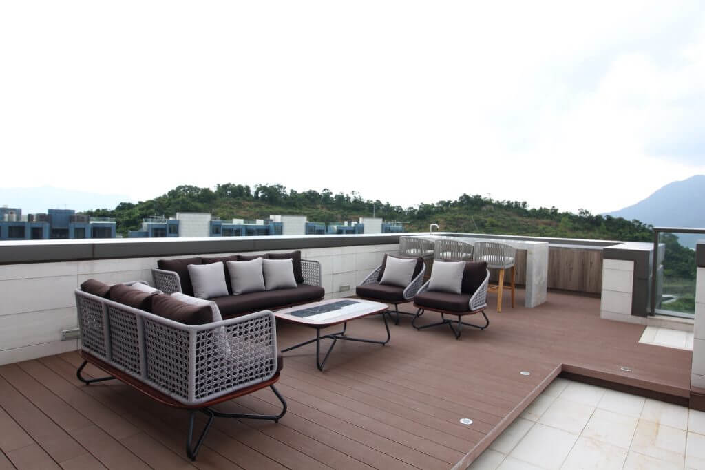 大大的陽台設有小泳池,利用簡易的戶外沙發和桌椅配置,打造出一個充滿自然氣息的多功能休閒空間。