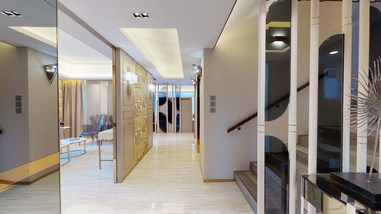從一進大門的玄關特色牆到客廳電視特色牆、牆身層架以至天花,多個位置均以金鋼條貫穿。金色鋼條設計讓人感覺高貴,不但體現戶主的奢華品味,更讓傢俱獨具一格,讓室內充滿優雅和古典氣息。