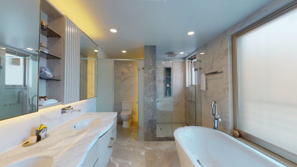 室內色調均以淺灰白色及大理石搭配為主,包括地板、茶几,浴室牆壁,都可見得到大理石元素的蹤影。它獨一無二的天然紋理以及光滑堅固的質感是它魅力的所在,亦是讓整個設計升華很重要的一環。
