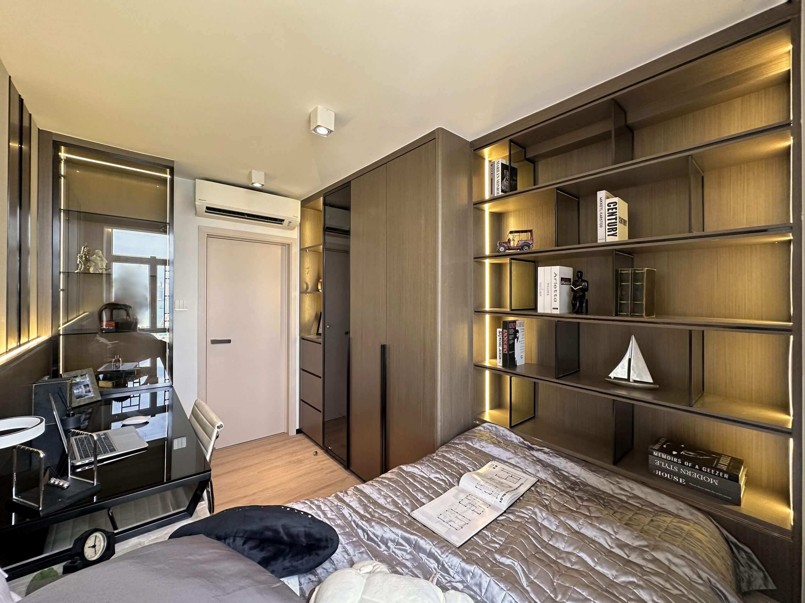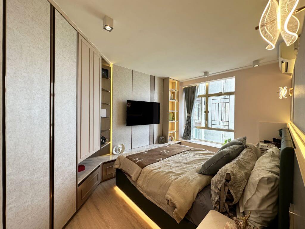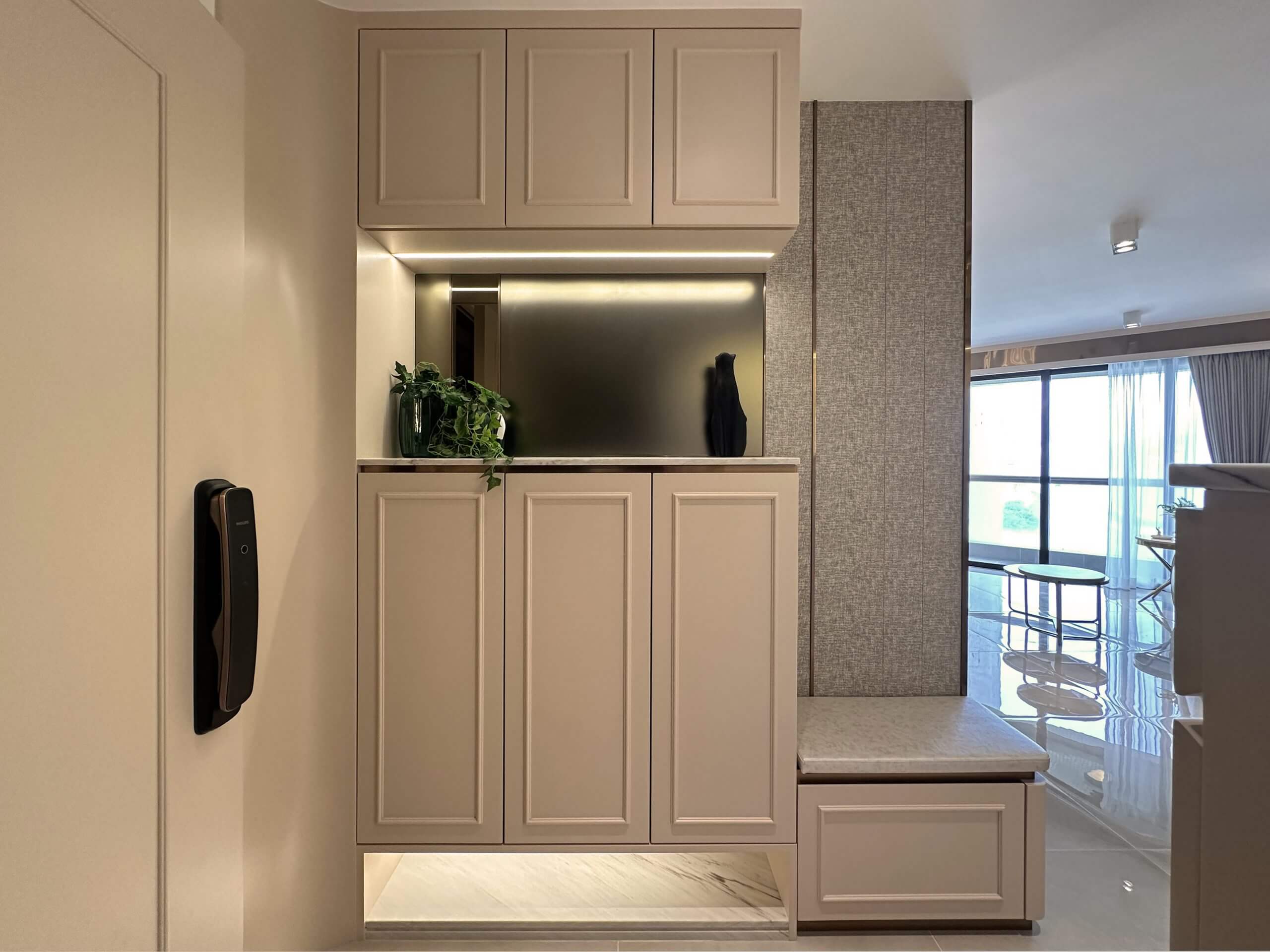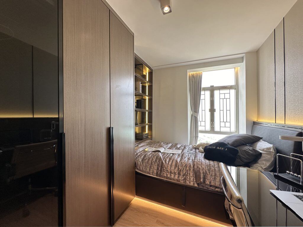 利用新造儲物櫃打破了原單位鑽石型客廳的空間局限問題,提高了走廊的使用率,讓客廳美即美觀又實用。