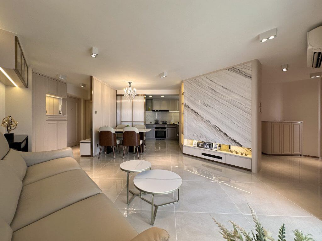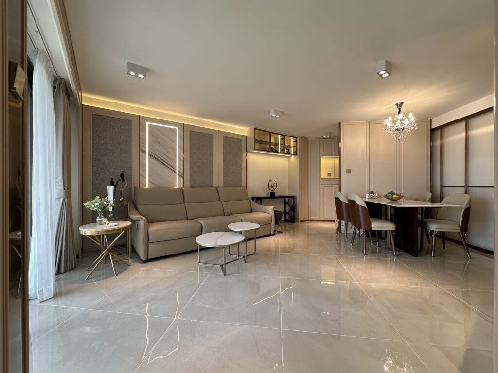 飯客廳位置色調大部份以米白色為主色,露臺位置窗框用上玫瑰金鋼打造,而牆身多處添加歐式花線設計,