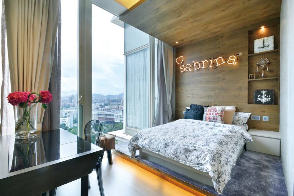 廚房亦利用玻璃引入充沛光線,當趟開玻璃門達致裡外連貫,擴闊空間。作開放式規劃的廚房極具空間感,工作檯面以黑色人造石焗漆的全高櫃搭配啞色木飾面地櫃,效果稍作變化。房間突顯獨特個性,女兒房以木色作主導,床頭牆以松木飾面更延伸至天花加入霓虹燈點綴。