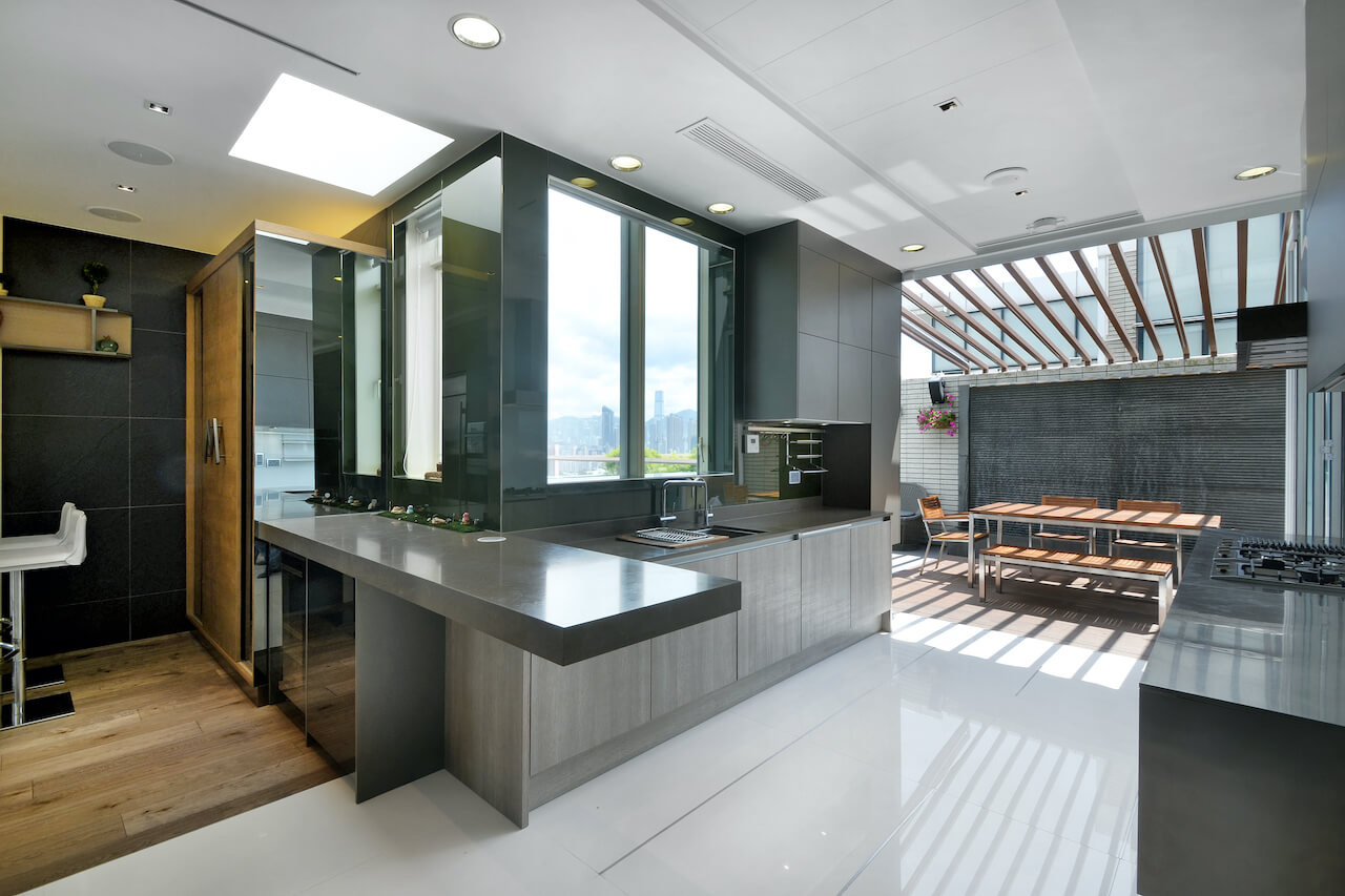 厨房亦利用玻璃引入充沛光线,当趟开玻璃门达致里外连贯,扩阔空间。作开放式规划的厨房极具空间感,工作台面以黑色人造石焗漆的全高柜搭配哑色木饰面地柜,效果稍作变化。房间突显独特个性,女儿房以木色作主导,床头墙以松木饰面更延伸至天花加入霓虹灯点缀。