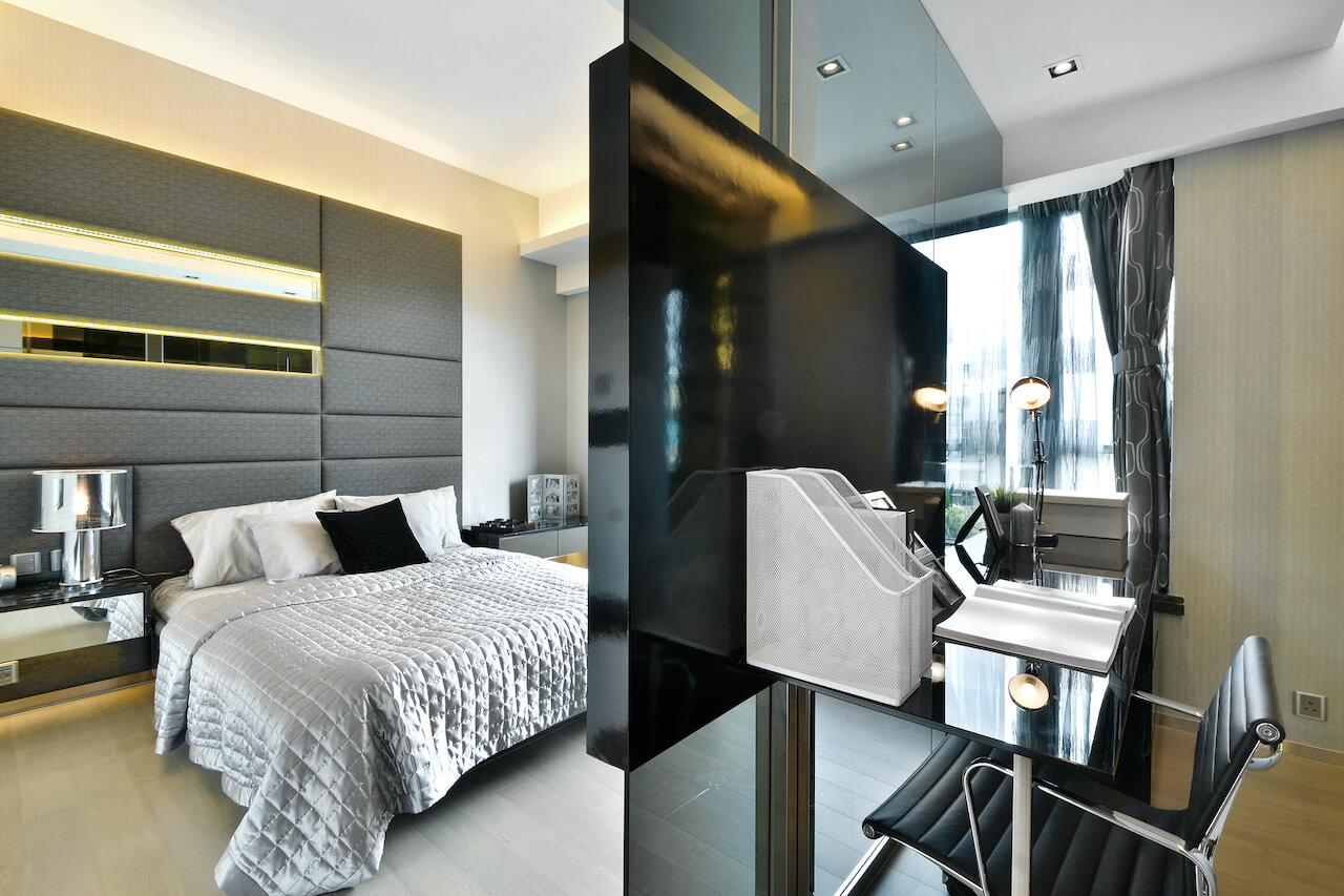 设计师以照顾居者日常需要、充分运用空间和营造时尚华美的格调为本。有见原来的厨房位于两厅之间且对向楼梯,于是将厨房与饭厅位置互换,令玻璃间隔的厨房能对向幽静雅逸的屋苑内貌,以点染悠闲自在的气氛,提升采光度,同时使空间属性与起居编排更见合理。给客人打造宽敞的环境及注入自然气息。
