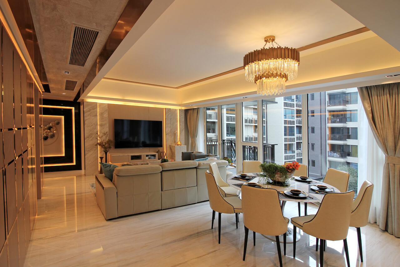 客厅的空间布局亦呈现干净俐落的线条,由吧台位置,到饭台再到茶几,由高至低丰富了整体的层次感。客厅左侧的鞋柜门运用了钢材,配合同色系的扪皮及木饰面,让豪华与摩登同时并列。