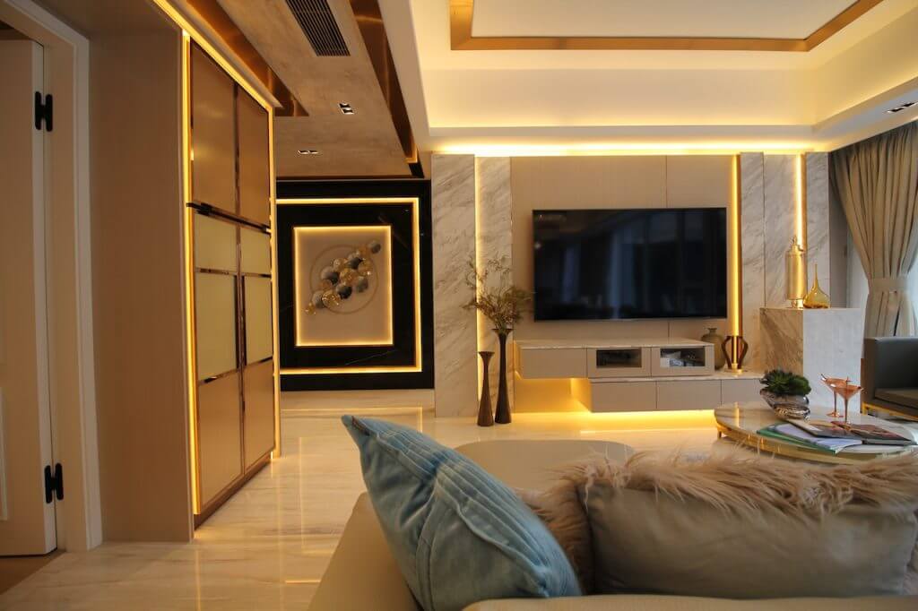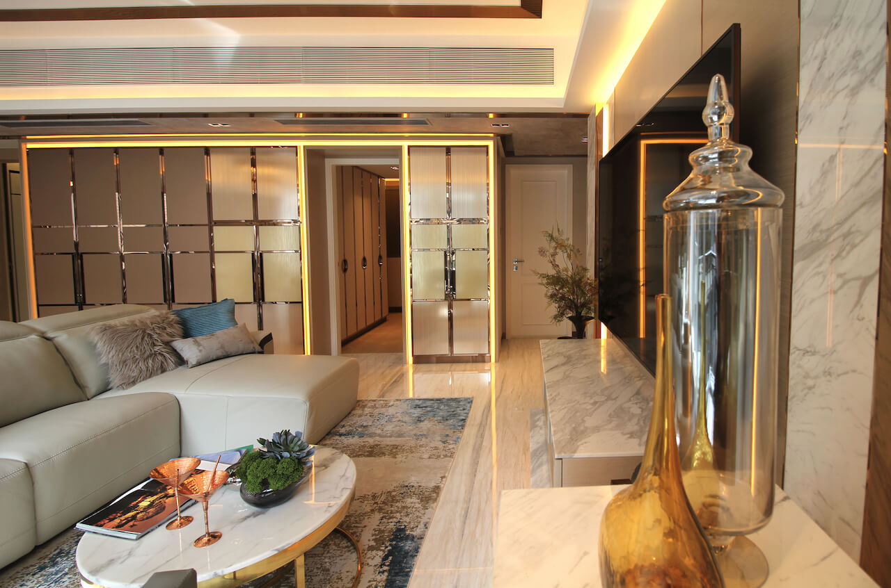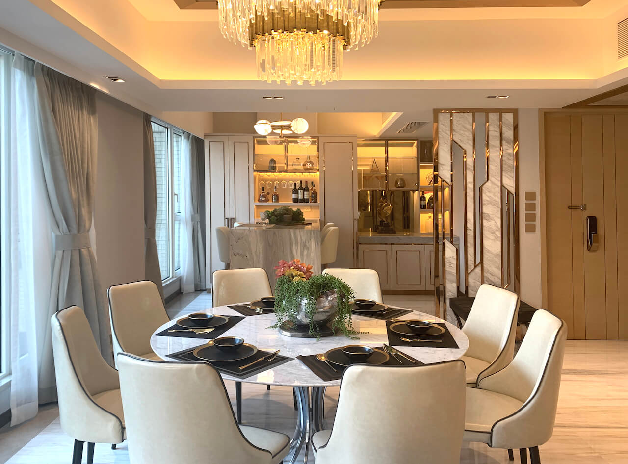 一进大门一幅立体云石特色墙映入眼帘,四边的渗光效光犹如云石画框,营造出既沉稳又高贵的格调。整间屋配搭了各种不同的物料,包括云石、金属、木材和皮等,塑造出高贵的感觉。客厅的空间布局亦呈现干净俐落的线条,由吧台位置,到饭台再到茶几,由高至低丰富了整体的层次感。客厅左侧的鞋柜门运用了钢材,配合同色系的扪皮及木饰面,让豪华与摩登同时并列。