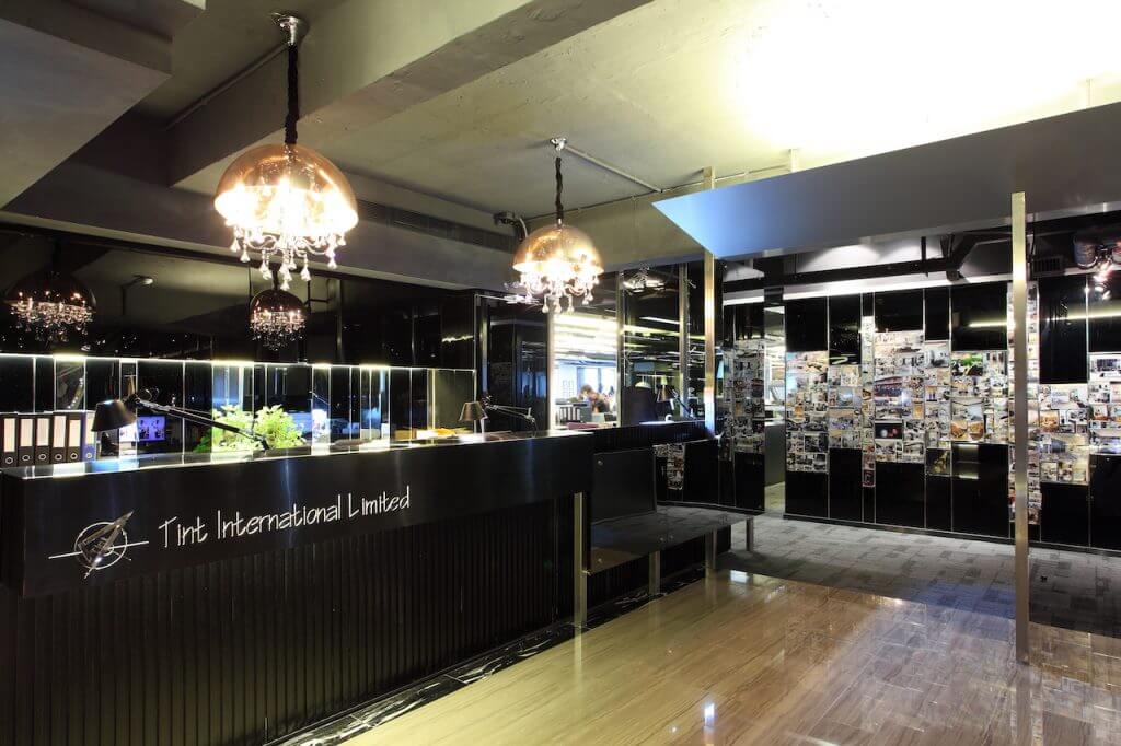 陈列室内设计师利用图案分明的墙纸清楚区分每一个不同功能的展示区。加上各式吊灯及地毡,公司风格更见明显。为了令以黑色作为主调的办公室不会过份单调阴沉,设计师善用了大片的向海窗户,大量自然光入室;半开放式的茶水间可谓把单位有利的位置善用与员工共享。
